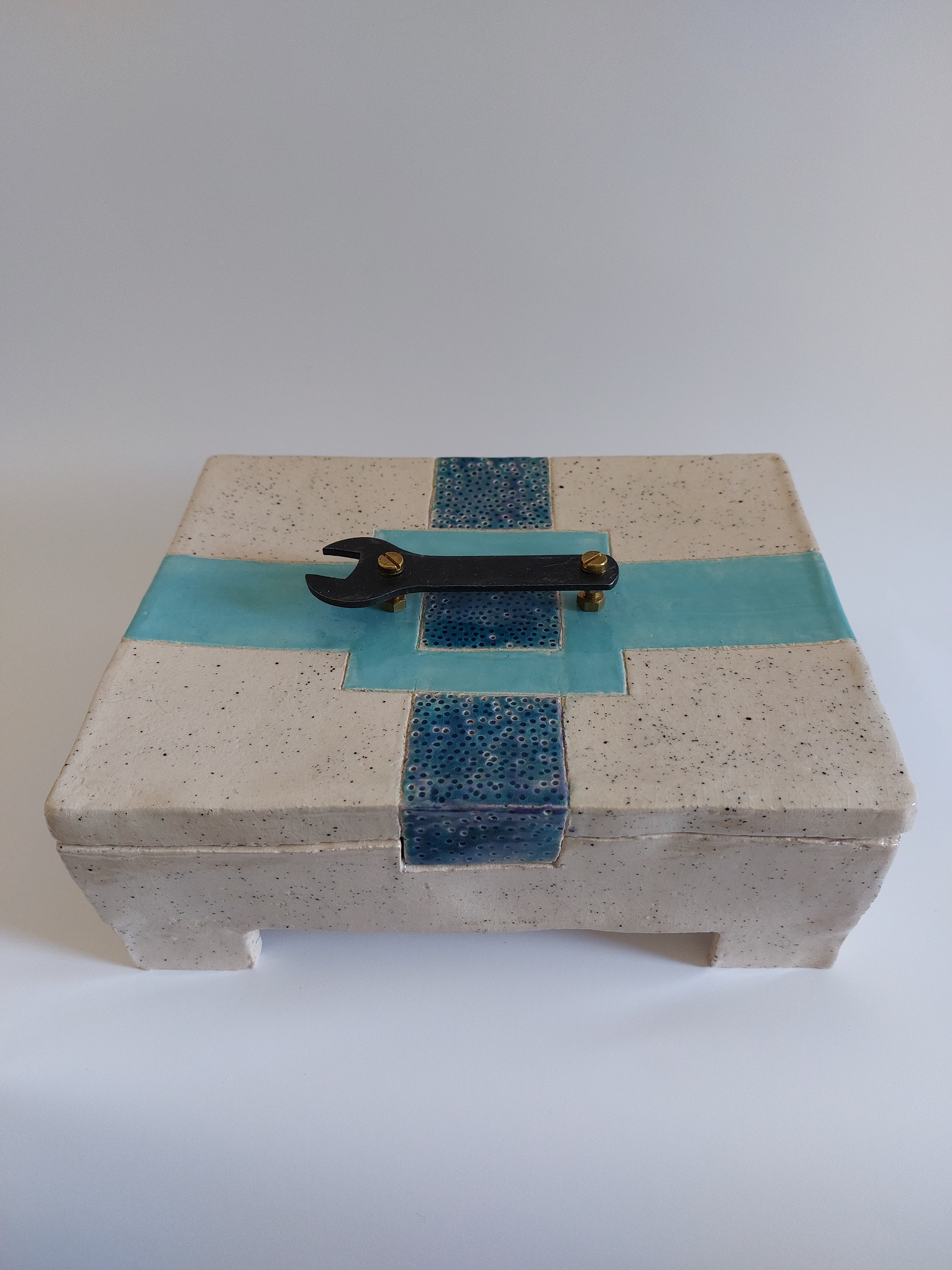 Kistje transparant met twee kleuren blauw, gestookt op 1100 graden. Mooie geglazuurde binnenkant. Steeksleutel als decoratief handvat.