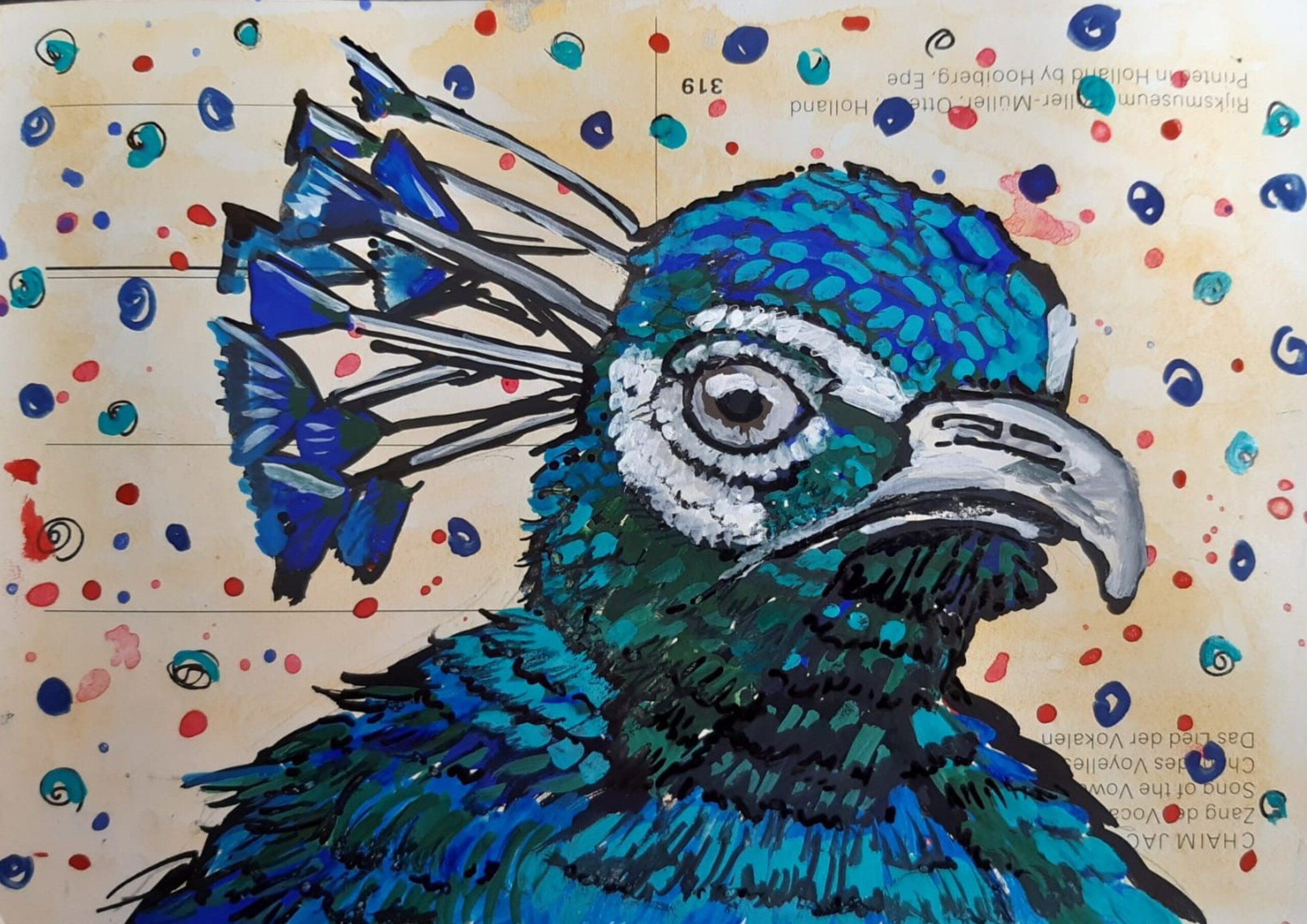 Pauwenkop. Gouache op oude ansicht. Deel van serie Vogels in gouache, werken op ansichtformaat. De serie, gestart in 2022, bevat inmiddels ruim 25 schilderingen van vogels op achterzijde van oude ansichten. Formaat van het werk. De meeste kaarten zijn rond de 9 bij 14 cm. Ze komen gelijmd op stevige zwarte ondergrond en ingelijst. Te zien in de tentoonstelling "Kunst op Pocketformaat" op Fort Maarsseveen (24 november - eind 2024) . Alle werken in de tentoonstelling hebben een lijst van 13 bij 18 cm.