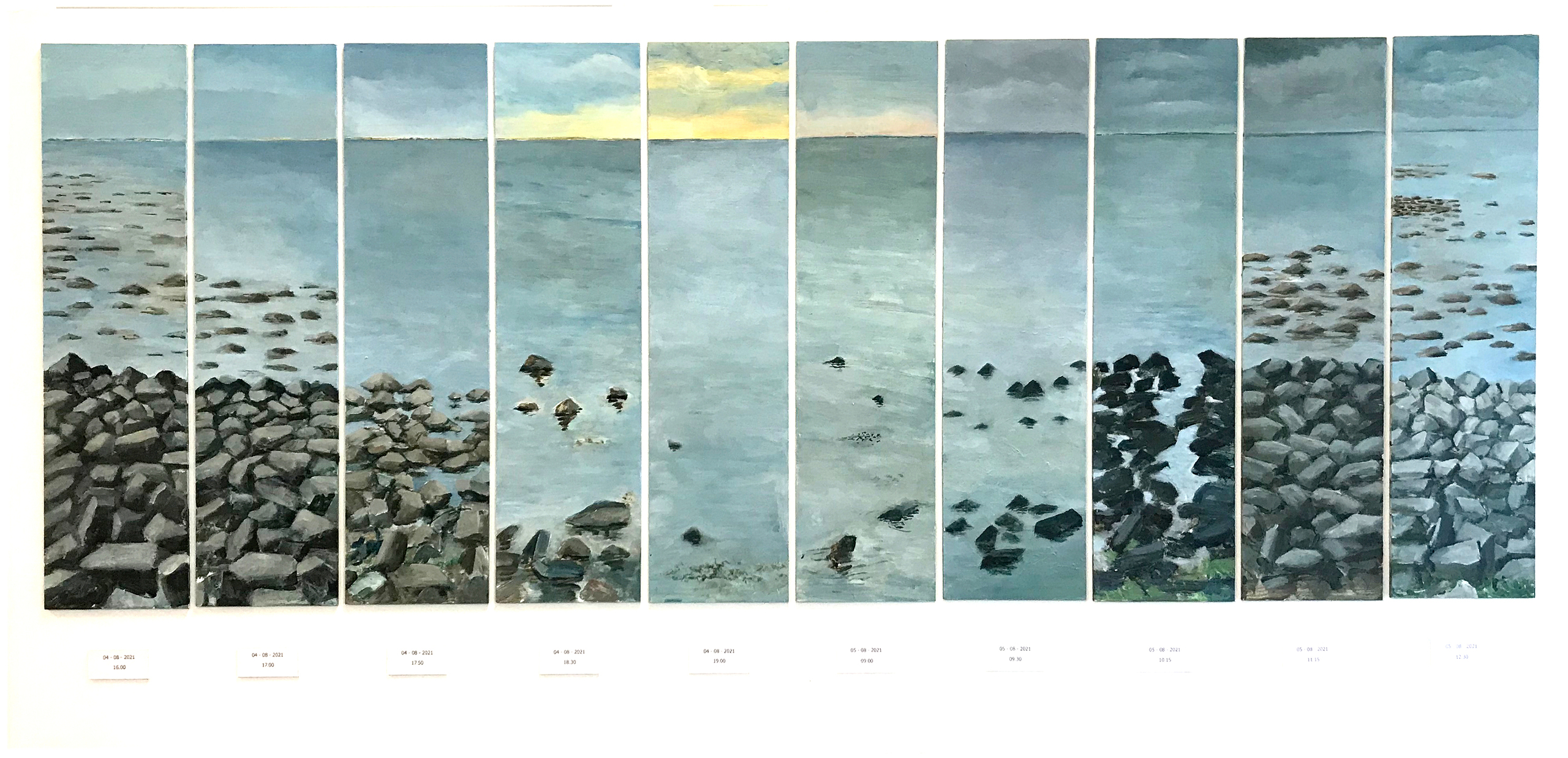 Waargenomen en plein-air geregistreerd landschap op verschillende tijdsmomenten om zo de verschillende stadia van vloed-eb-vloed vast te leggen.