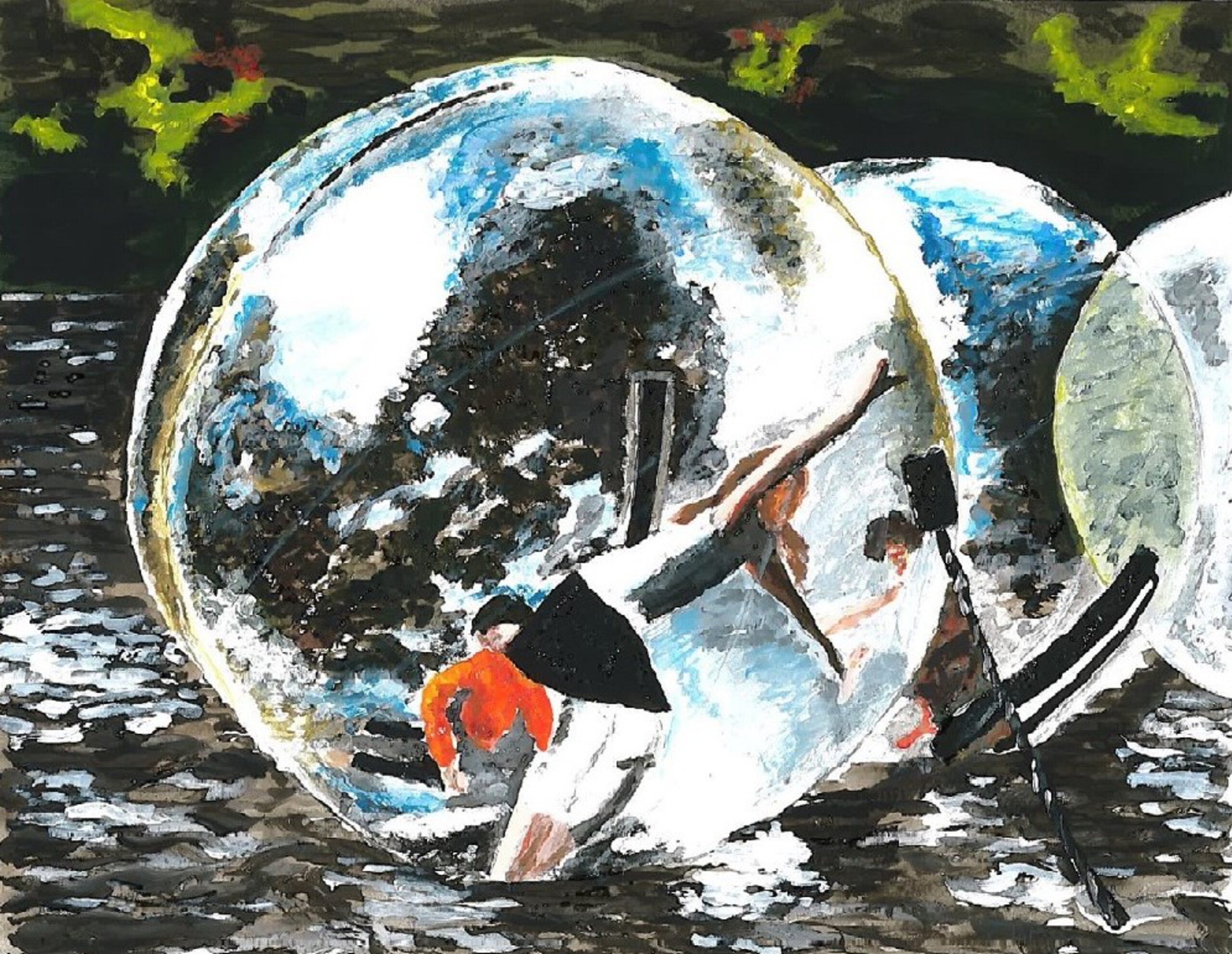 Schilderij aan de hand van een zomerse krantenfoto van spelende kinderen in een grote doorzichtige plastic ballen op het wateroppervlak.