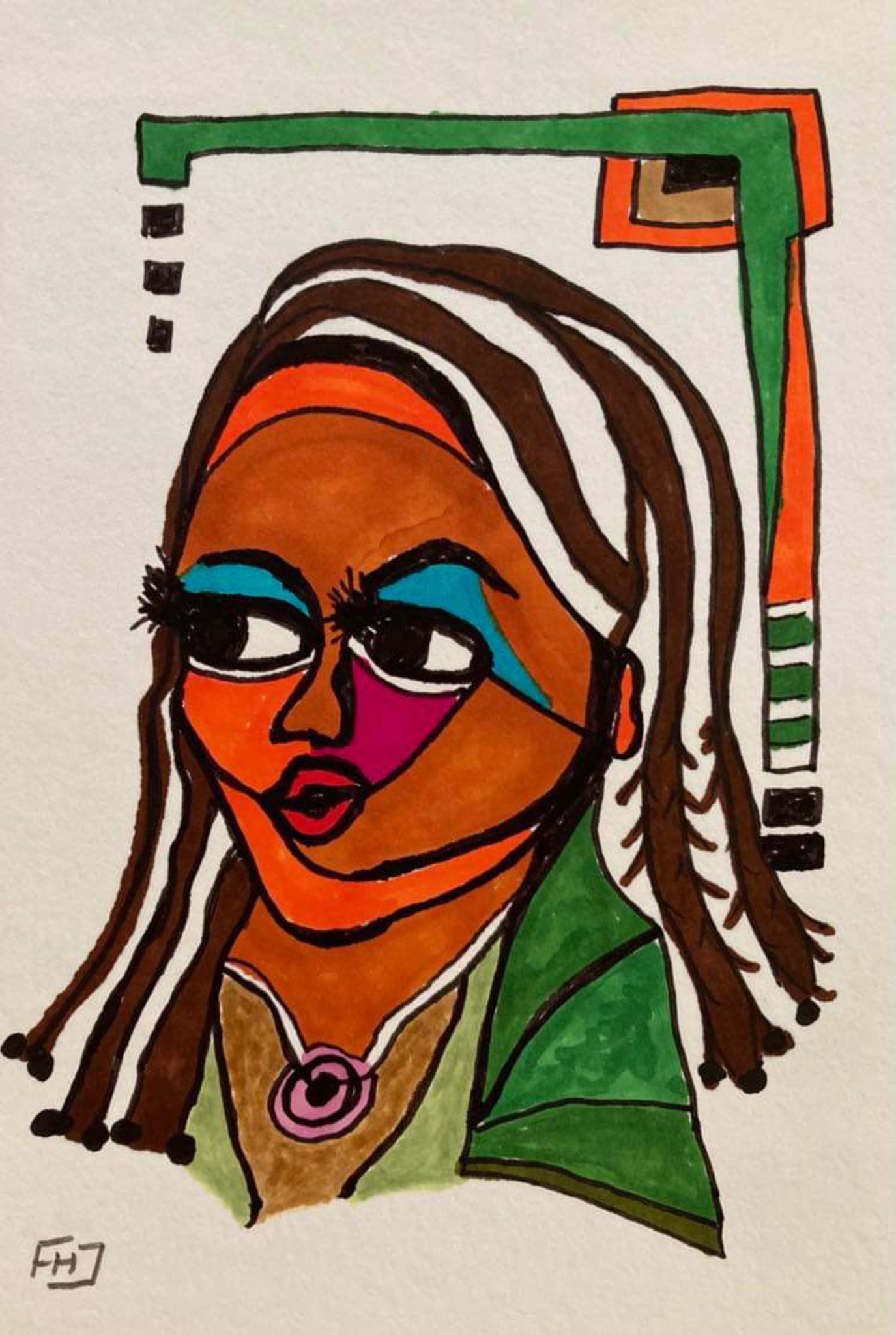 Portret, bruin, meisje. Markers, gel-pen