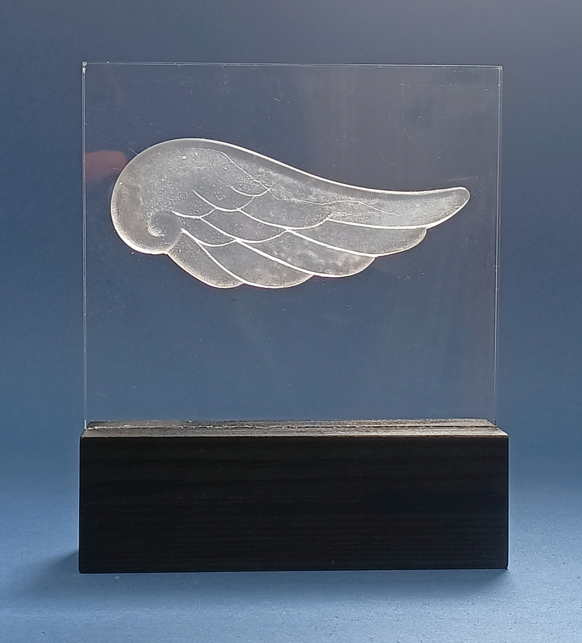 Een van mijn favoriete onderwerpen: de vleugel. Dit keer in een transparante uitvoering die de lichtheid van het onderwerp nog eens onderstreept. Epoxy, plexiglas, hout.