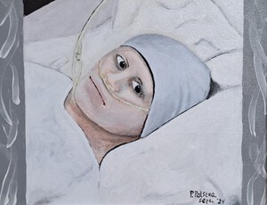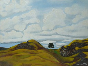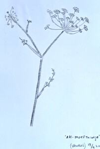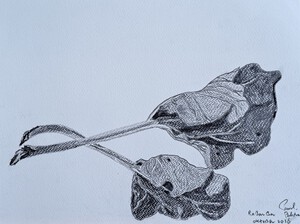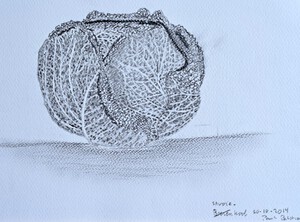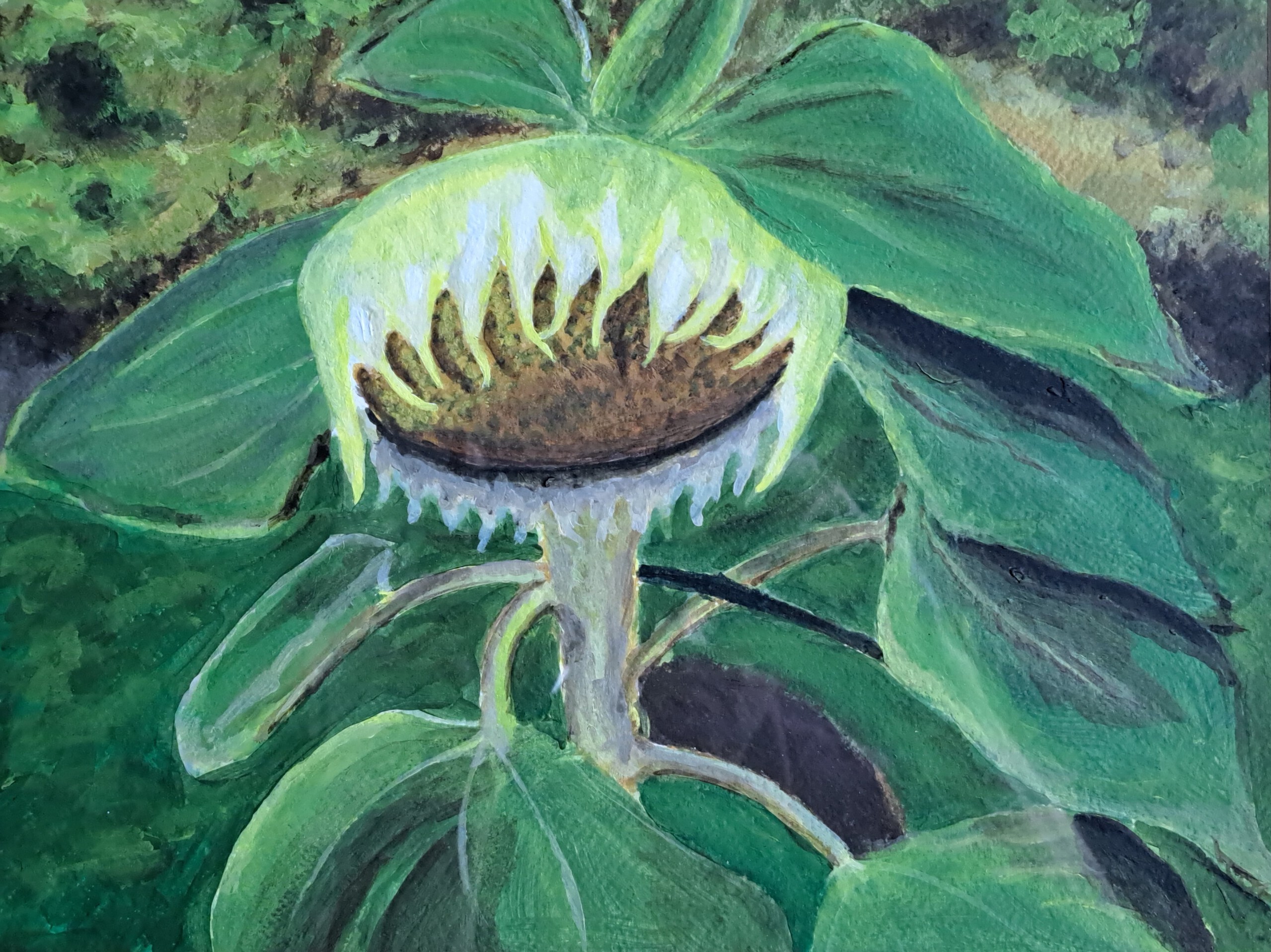 Zonnebloem. De bloem is over haar hoogtepunt en topzwaar van het vele zaad dat zij draagt. Ik schilderde de bloem aan de hand van een foto nadat ik dit vooraf liet gaan door een oefening in de vorm van een potloodtekening ervan. Deze kunt u desgewenst in mijn groep 'Tekeningen' bekijken.