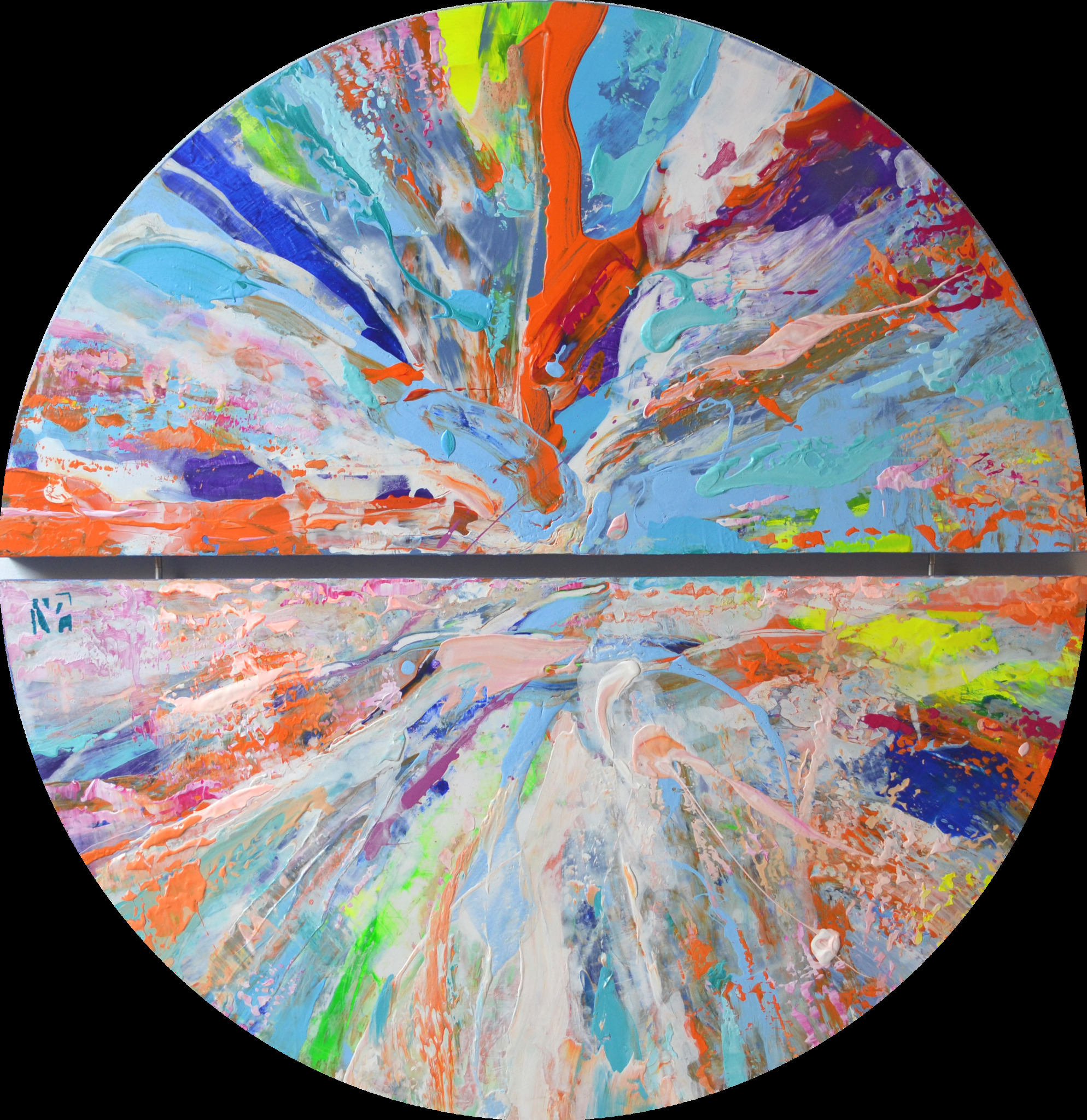 In this piece, I've unleashed a vibrant burst of energy and emotions through interplays of acrylic and oil. The dynamic splashes and sweeping strokes across the round panel emulate a celestial explosion—reflecting life's beautiful chaos. It's designed to invigorate any space, instilling a sense of awe and dynamic movement, encouraging viewers to embrace the unpredictability and spectrum of experiences life offers.