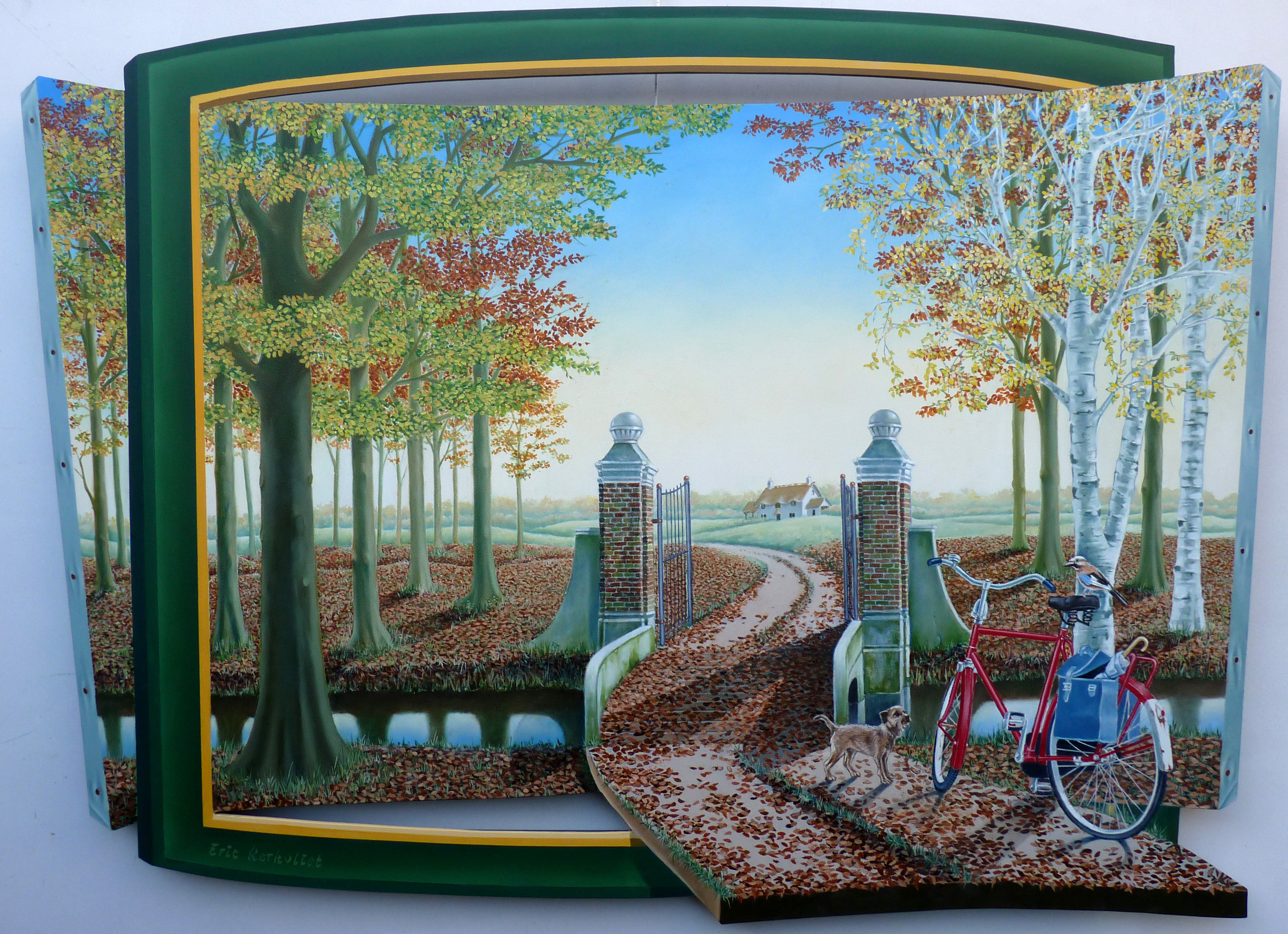 Eric Kerkvliet schildert met olieverf uiterst gedetailleerd voorstellingen op iets verhoogd paneel waardoor bij juiste belichting een Trompe-l’oeil-achtig effect ontstaat.