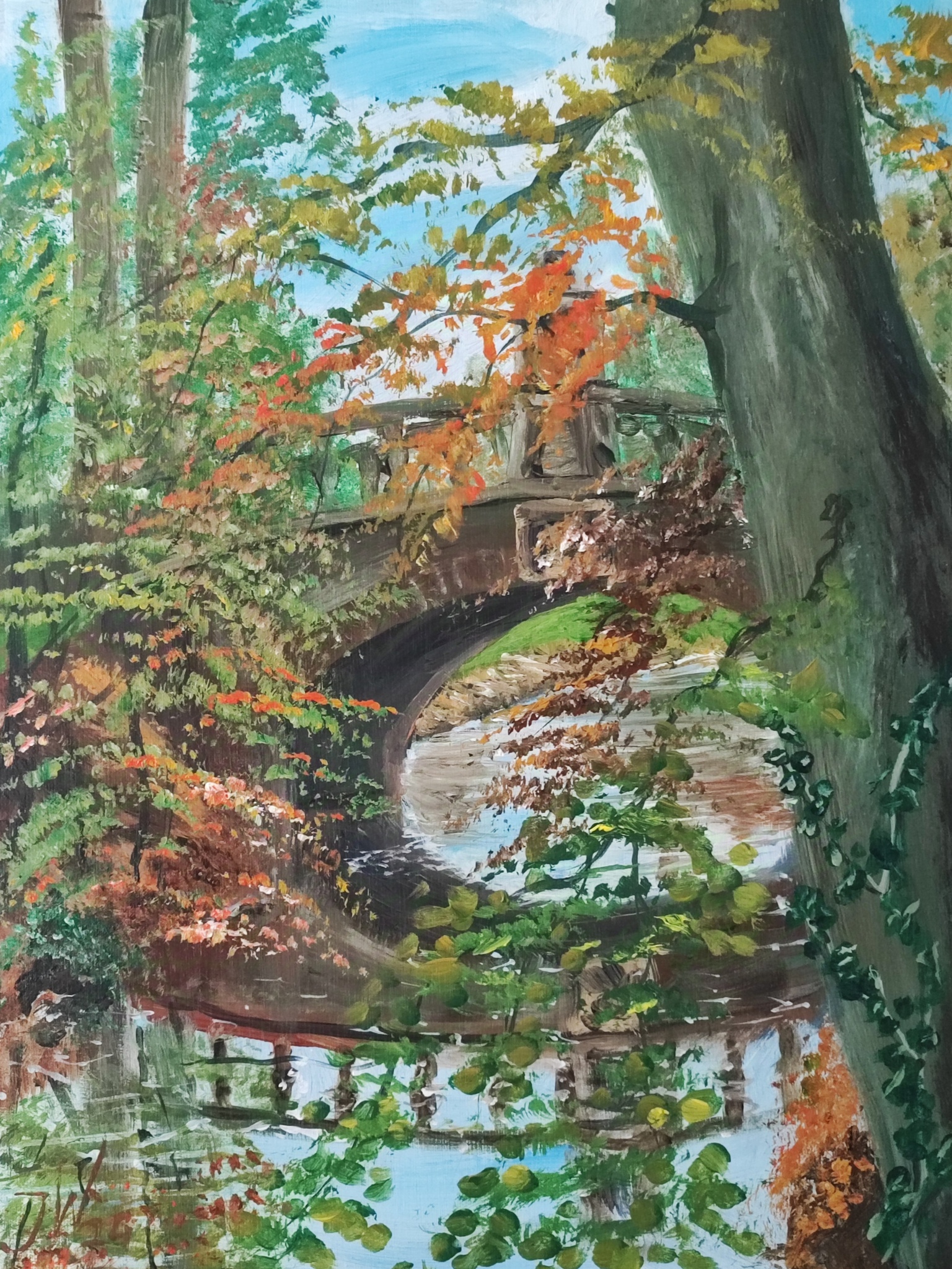 De brug zelf met beelden vond ik te ingewikkeld voor acryl binnen twee uur. Dus afgedaald naar het water en de brug van de zijkant gedaan. Mede door het herfstblad hoefde ik de brug niet te gedetailleerd uit te voeren.