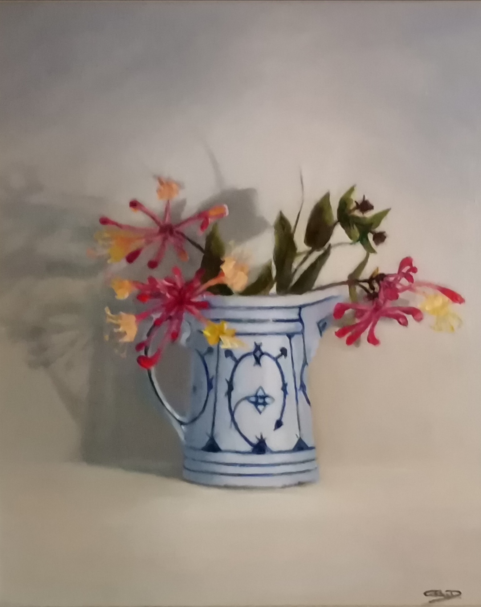 Figuratief Realistisch Olieverf Doek Bloem Plant Kleur Melkkannetje Schaduw Kamperfoelie Blauw-wit Jägerporcelein