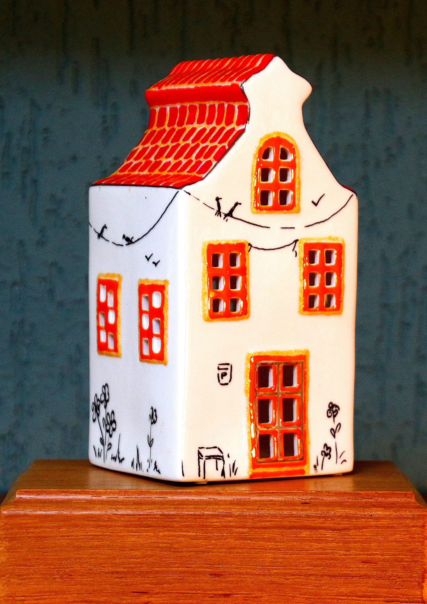 Een Porselijnen huisje met Rooddak uit een serie van 3 met Porseleinverf gedecoreerd Kan een kaarsje in..!