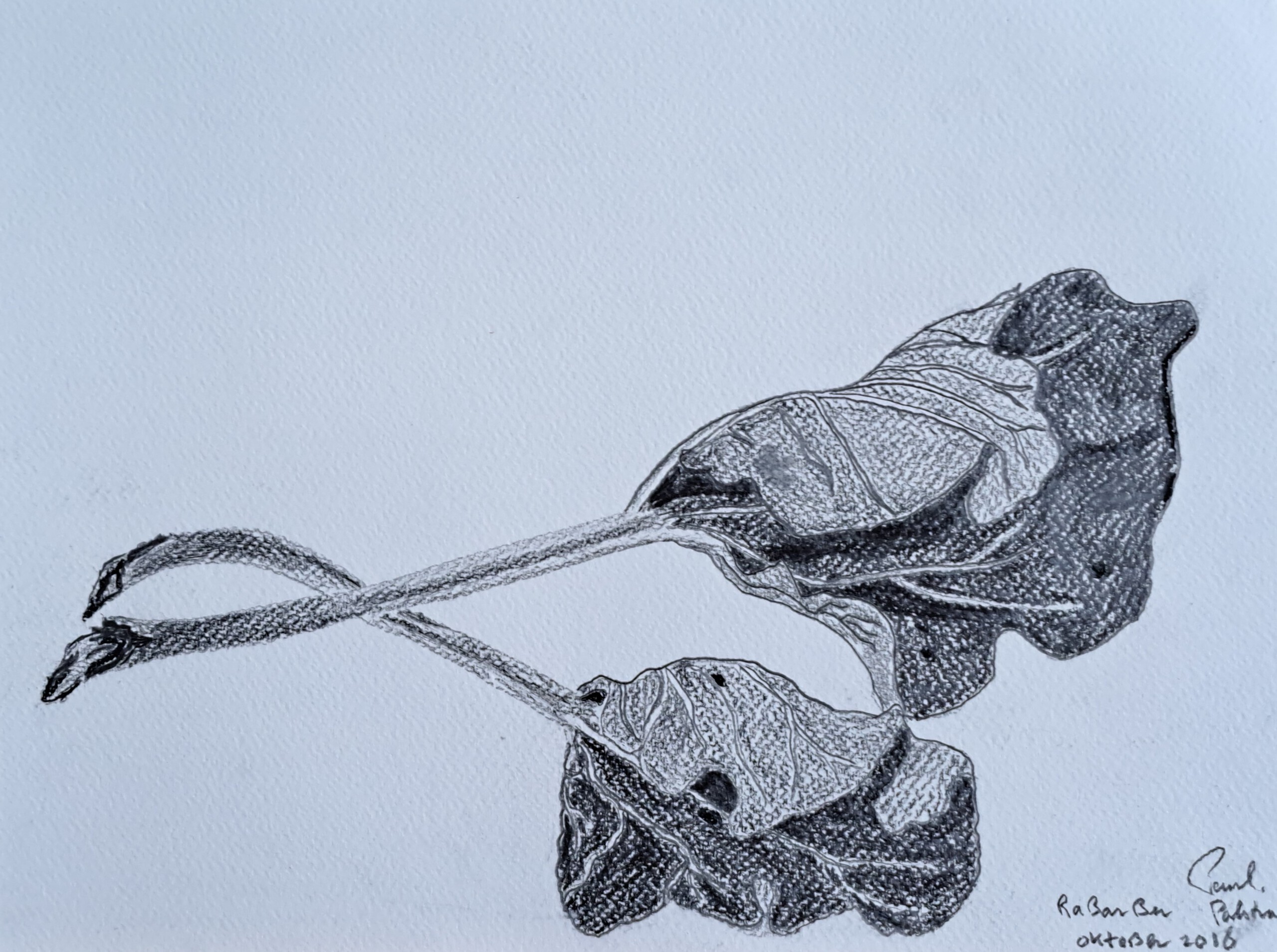 Rabarber. Twee stengels rabarber die door de vorm en nerven van zichzelf al fraai genoeg zijn. Omdat de stengels ook nog eens mooi gekleurd zijn heb ik hiervan ook een schildering gemaakt. Deze kunt u zien in de groep 'dieren en planten'