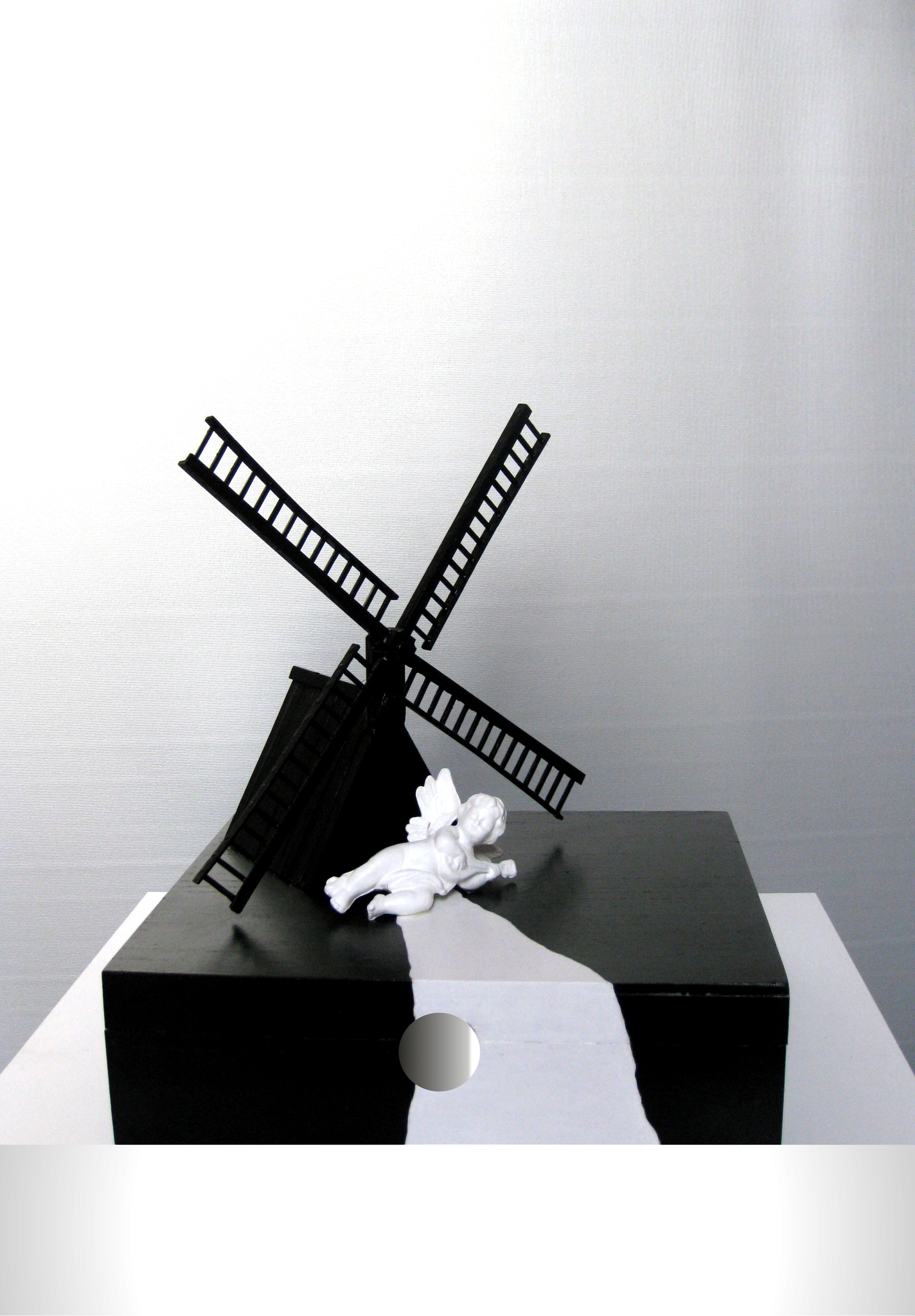 Detail installatie: Gevallen windengel. Beelden van eeuwen her worden uit hun context gehaald.