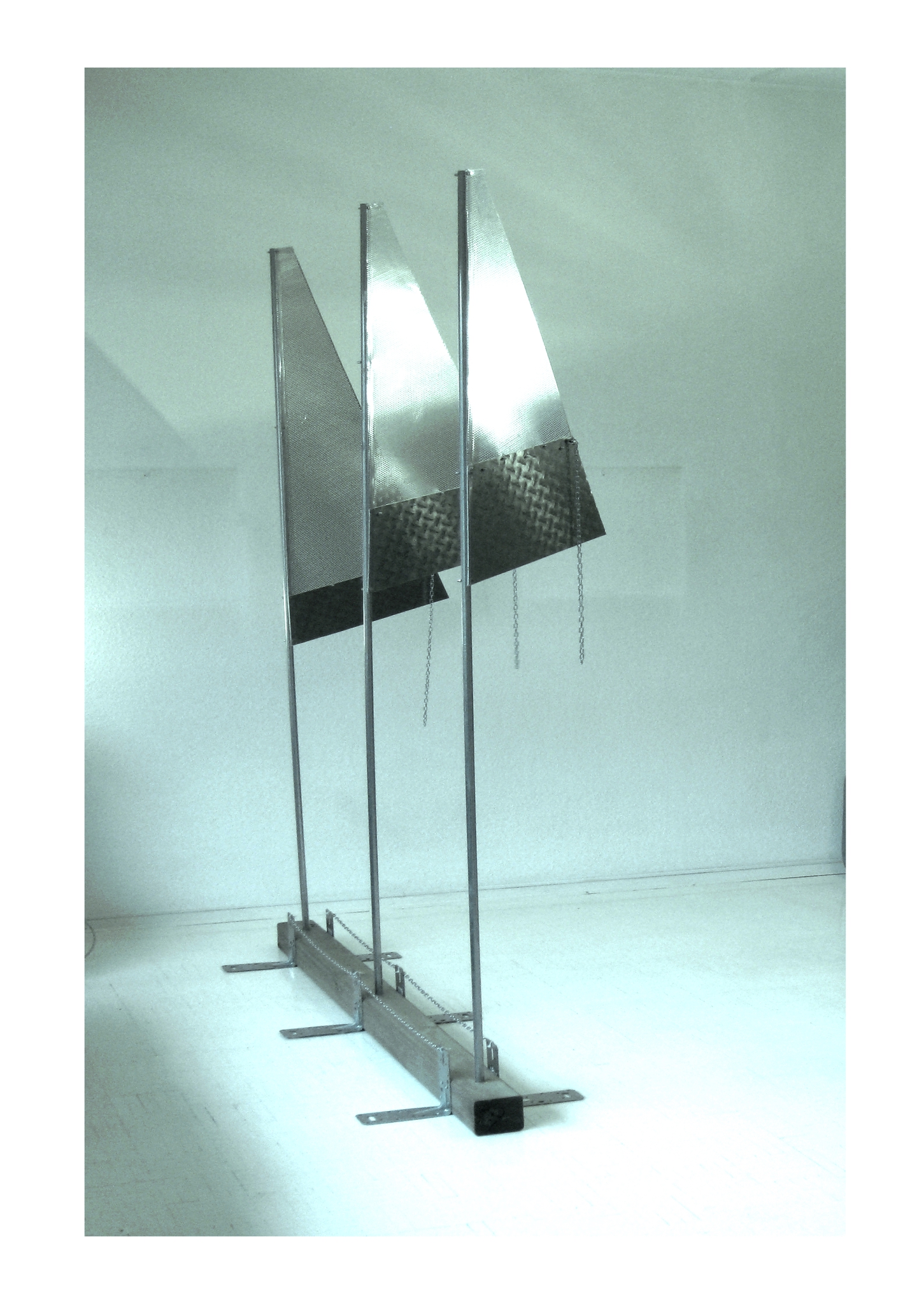 De installatie: 'De zeilen zijn gehesen' , is gemaakt van metaal en hout n.a.v. een thema-expositie in Galerie Kunst op 5 in Coevorden. Onder de titel: GEWONNEN EN ONTGONNEN is er samen met kunstenaars uit Coevorden gewerkt op een tegengesteld thema nl. zand en veen en klei en water.