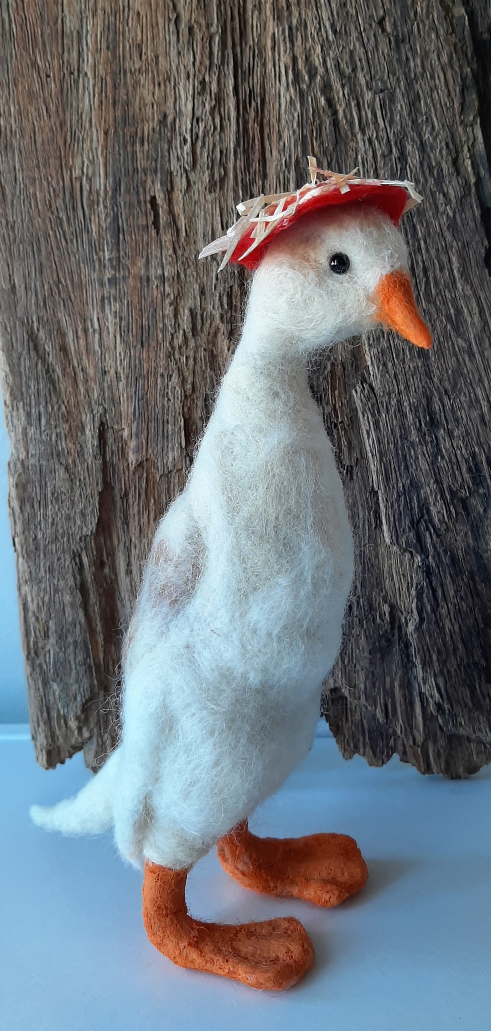Loopeend met hoedje genaaldvilt Afmeting H21cmxB7cm (gemeten op het breedste gedeelte van de eend) hoedje met stro is afneembaar voeten en snavel zijn gewaxed Verkocht