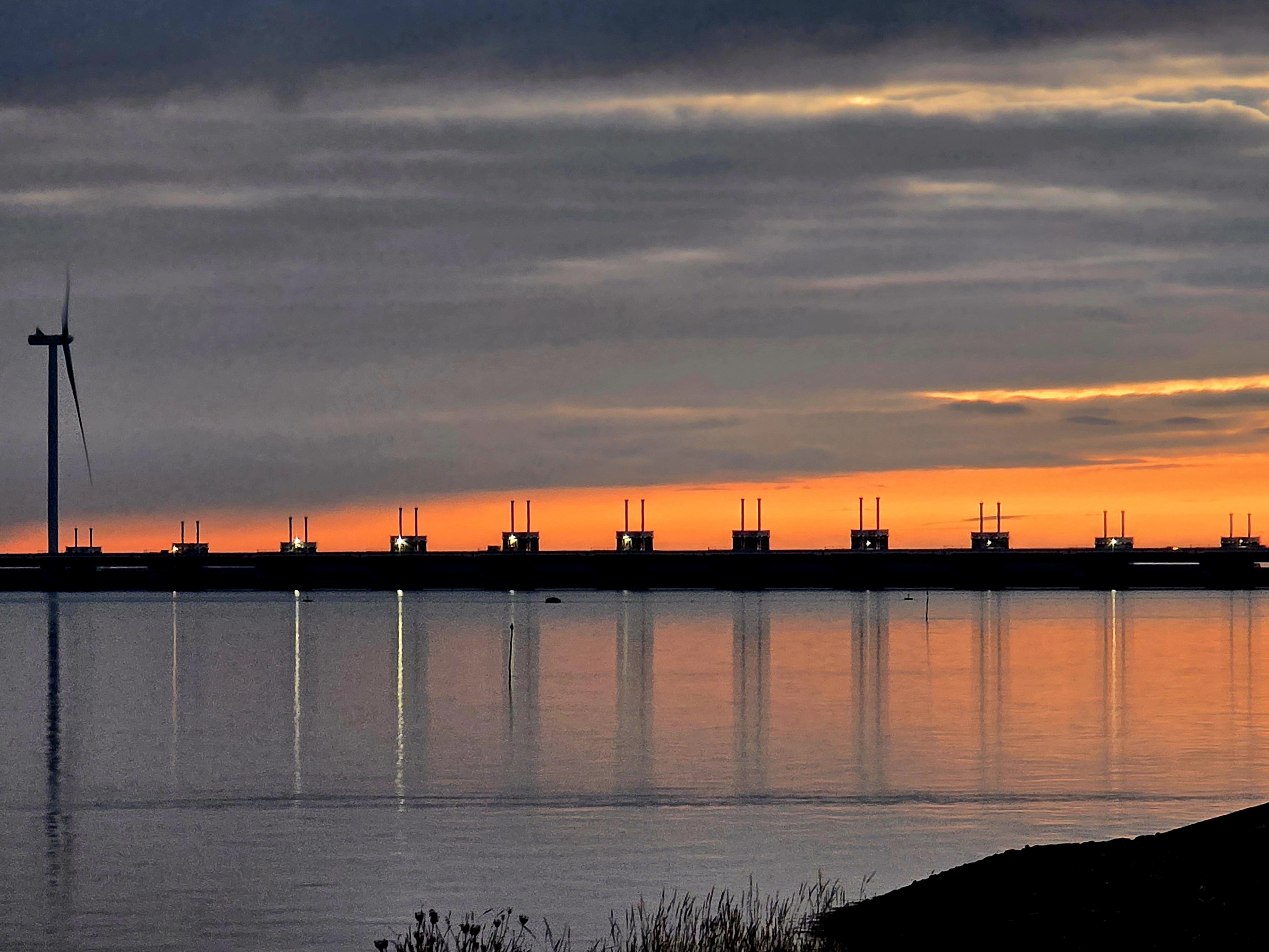 Ondergaande zon op de Oosterscheldekering
