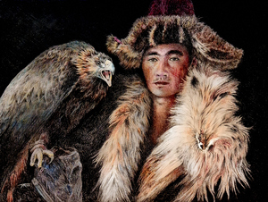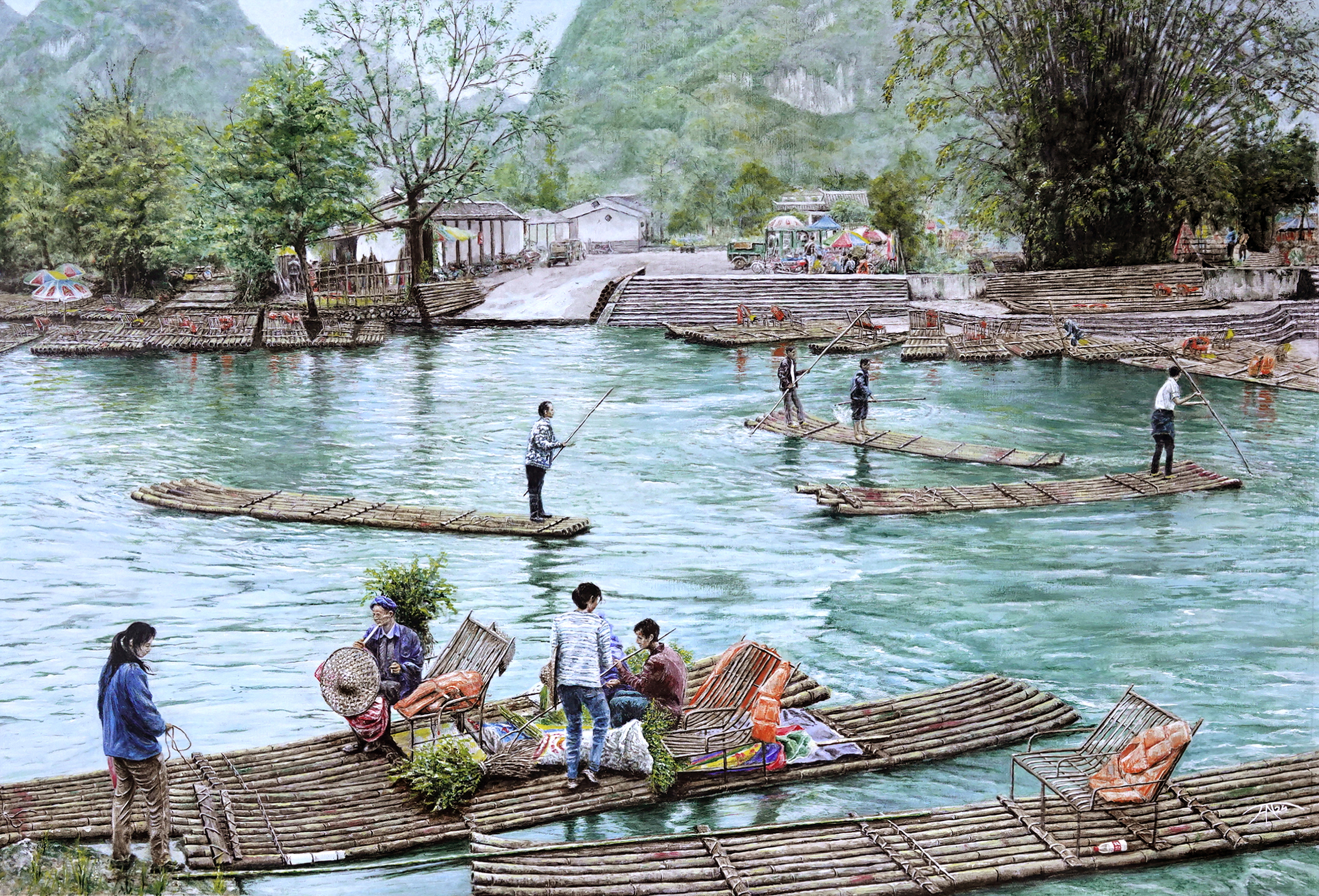 Op de Yulong rivier wordt je met bamboe vlotten over gezet. Dit acryl schilderij was een feest van details om te maken.
