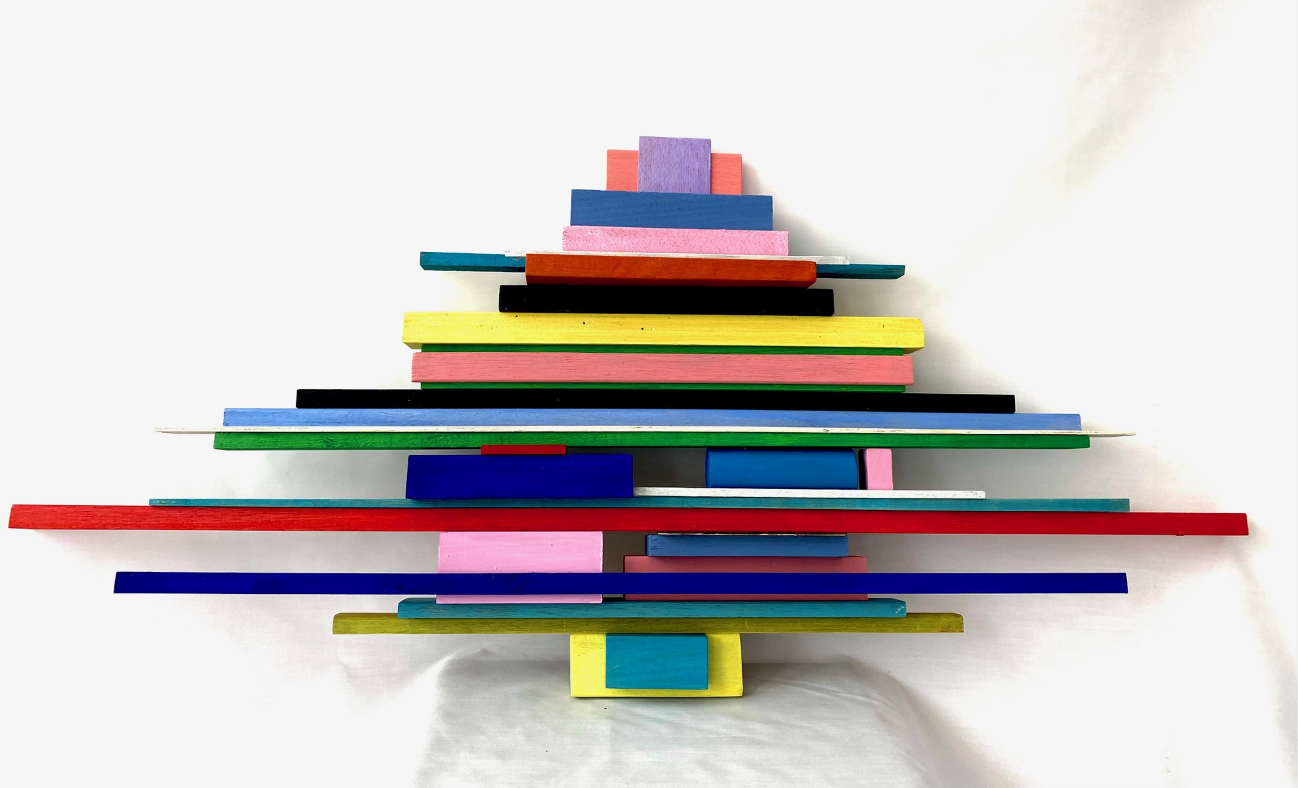 Wandsculptuur, hout, acryl. Ook voor dit werk zorgen lijnen en kleur voor het belangrijkste beeld.