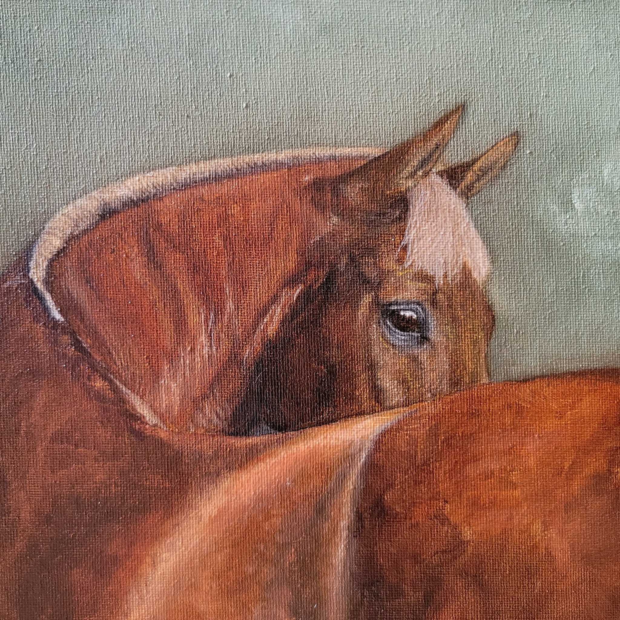 Een portret van een nieuwsgierig paard. De kleuren zijn warm, de achtergrond heeft koele tonen, als compensatie voor de roodbruine tinten van de vacht. Olieverf op doek