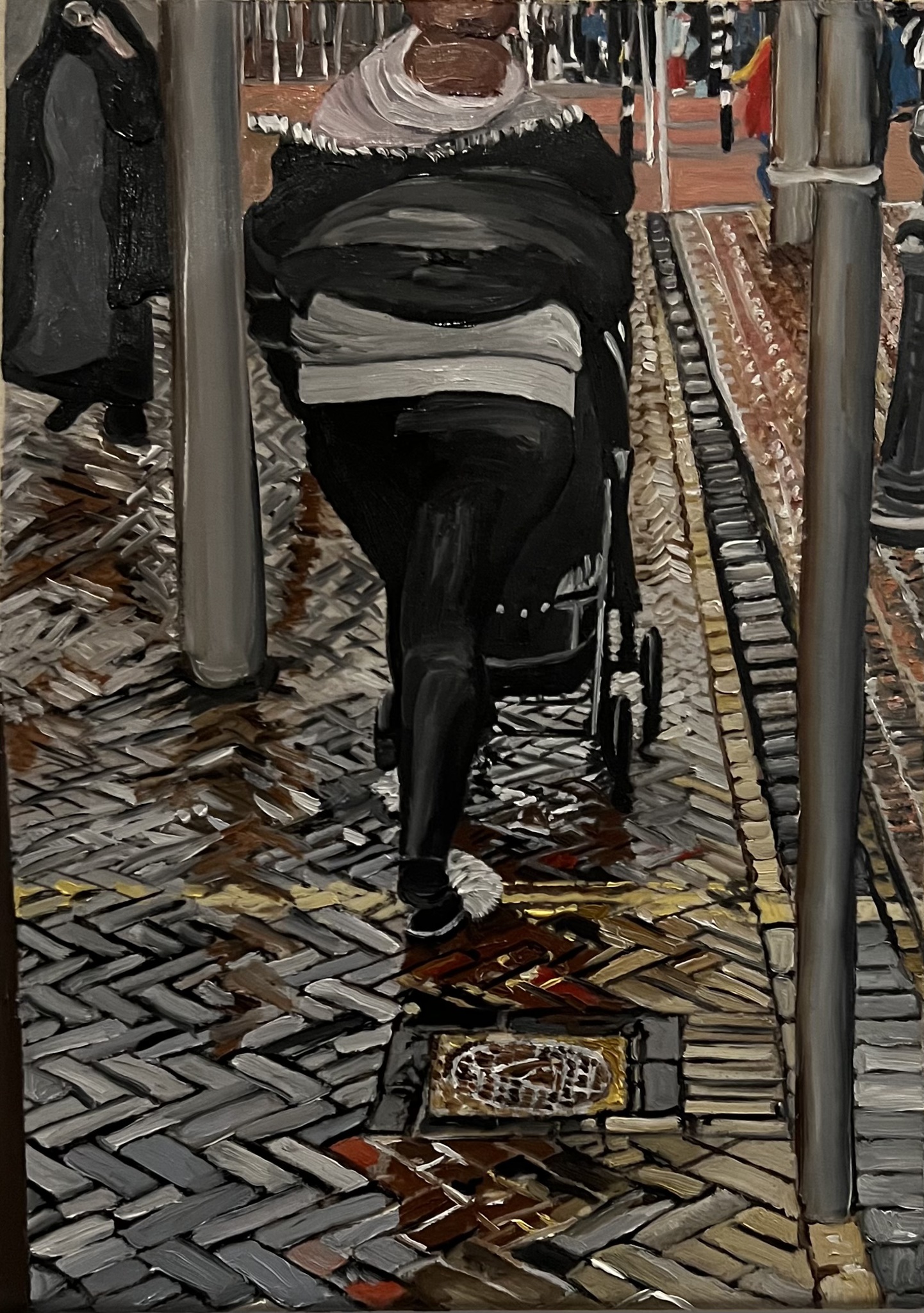Schilderij Vrouw Regen Straat Kinderwagen Nat