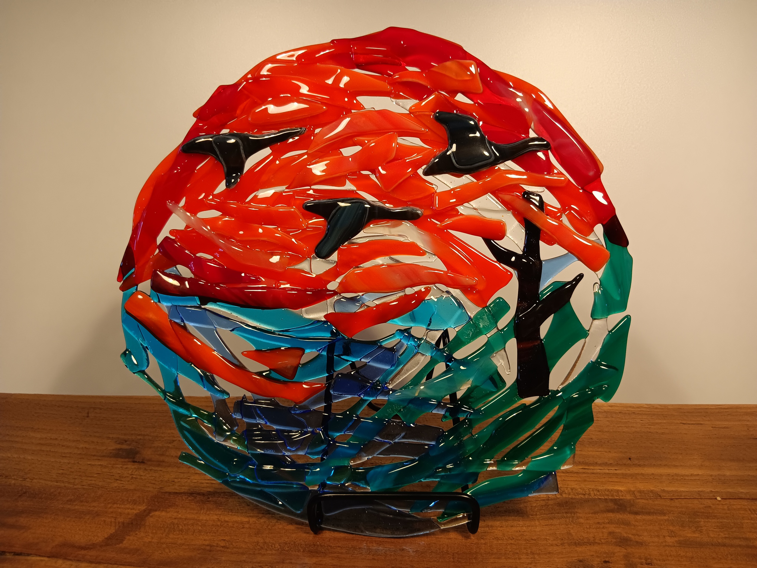 Follow me, follow you - Het is weer zover: de ganzen zijn in beweging. Gelukkig heeft Ed de trek van deze drie vastgelegd met behulp van gefused glas. Hier zijn de ganzen versmolten in kleuren op een avond dat de zon op zijn mooist was en het gekleurde glas dat is gebruikt brengt dit alles samen.
