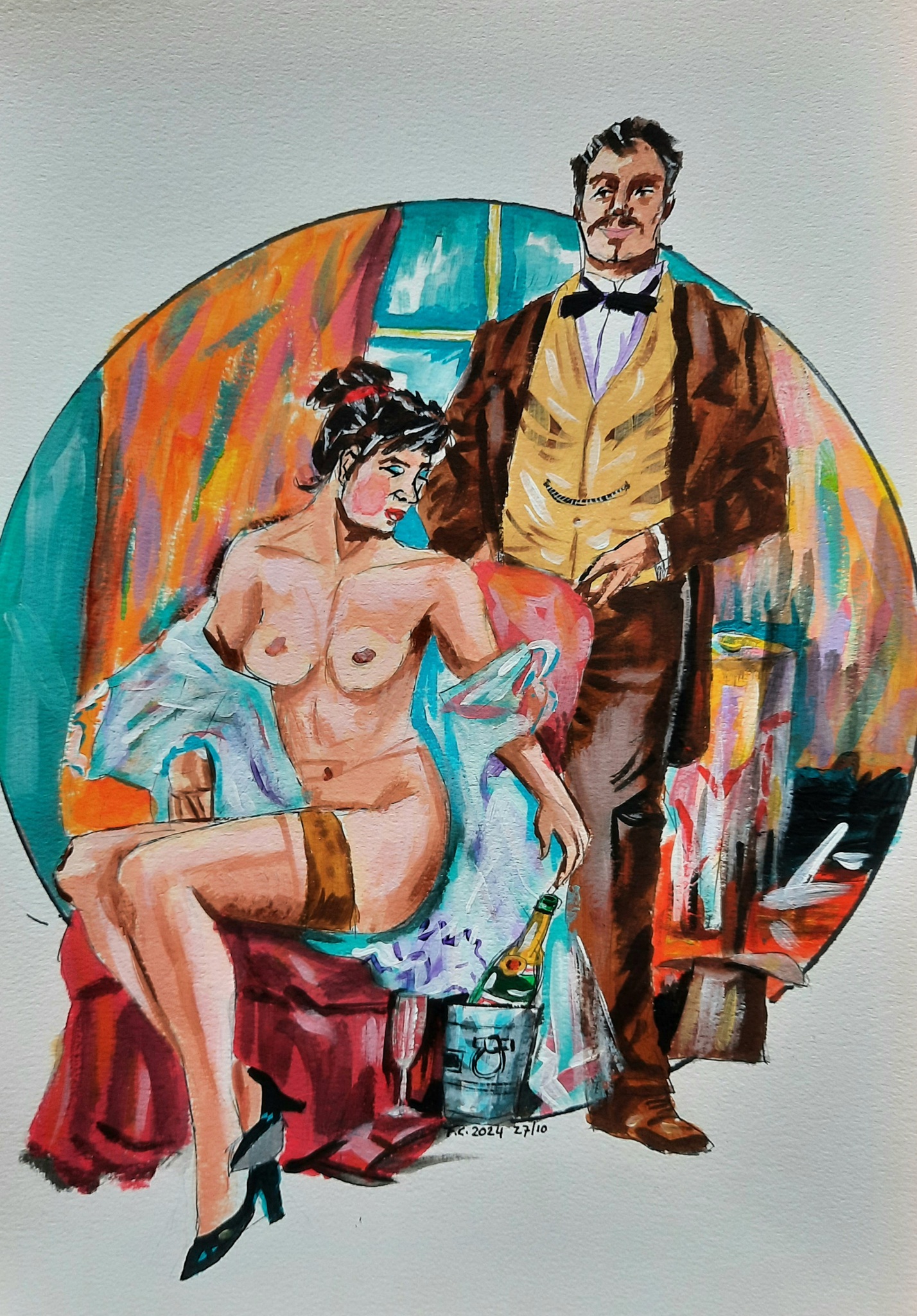 Vrouw Man Erotiek Champagne Lingerie Vintage Oudetijden Naakt Nude