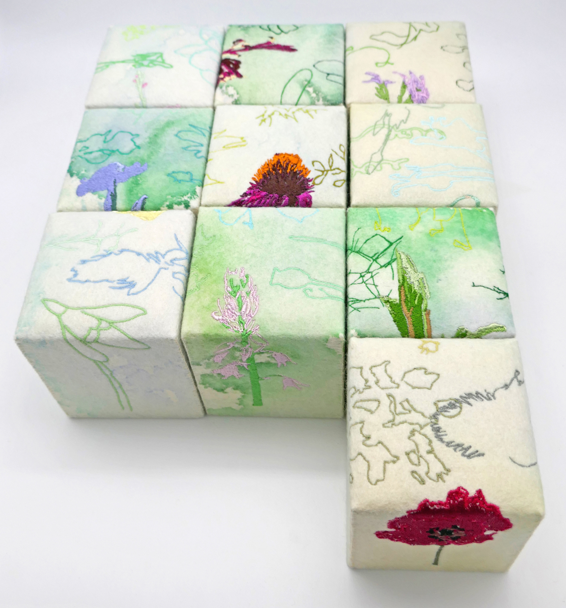 wolvilt en naalvilt, mat en glansgaren, borduurzijde, hout, foamplaat, 5 vlakken bekleed. Deels verkocht.