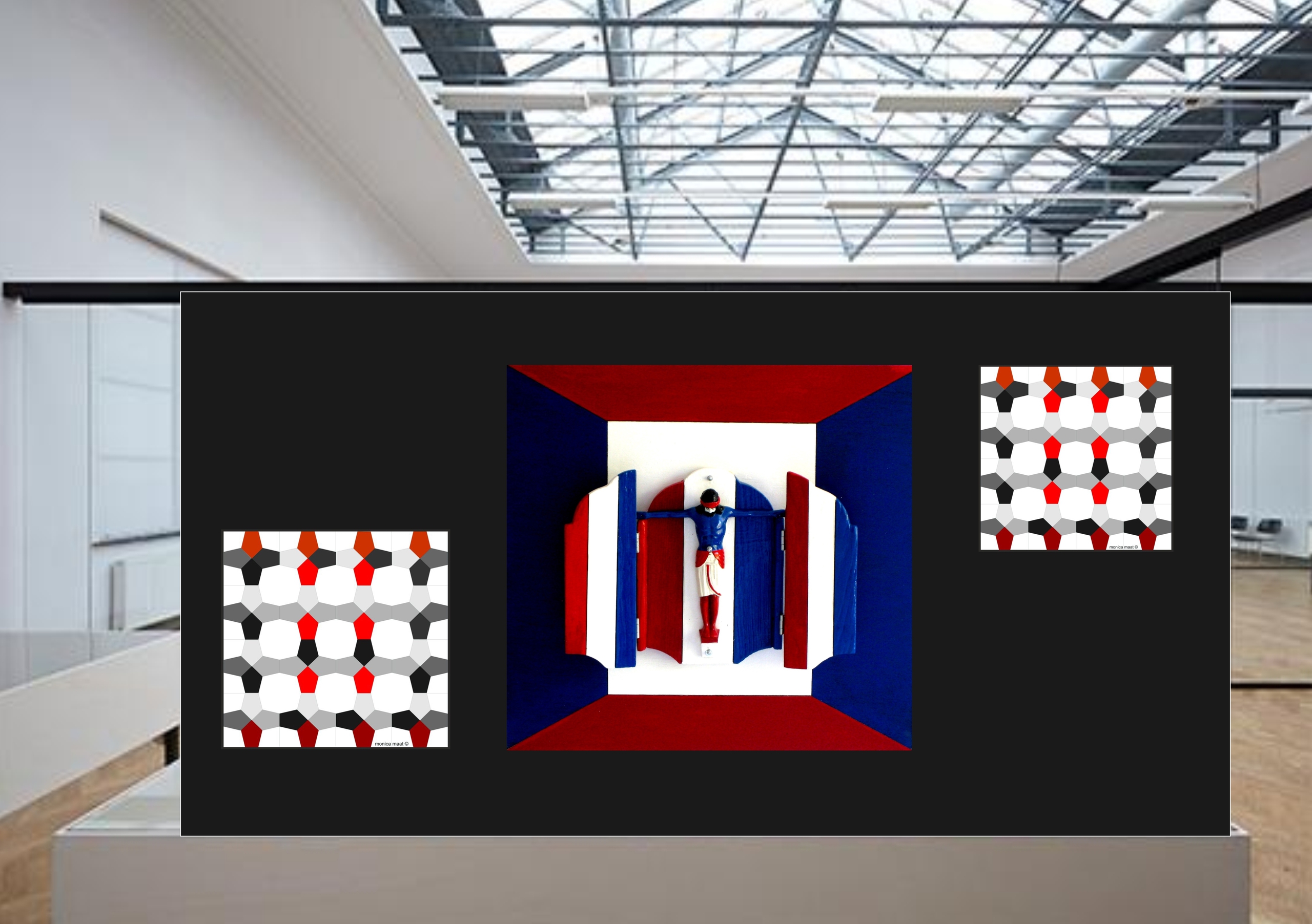 Nederlandse Jezus [Offerande]. Project installatie van hout met twee openslaande luiken en twee geometrische computerwerken met onregelmatige vijfhoeken rondom achthoeken op plexiglas. [Tevens geometrisch ontwerp voor kerkraam] De titel komt van een autistisch kind uit een schoolklas dat mijn atelier bezocht. [Nog niet te koop i.v.m. diverse toekomstige doeleinden]