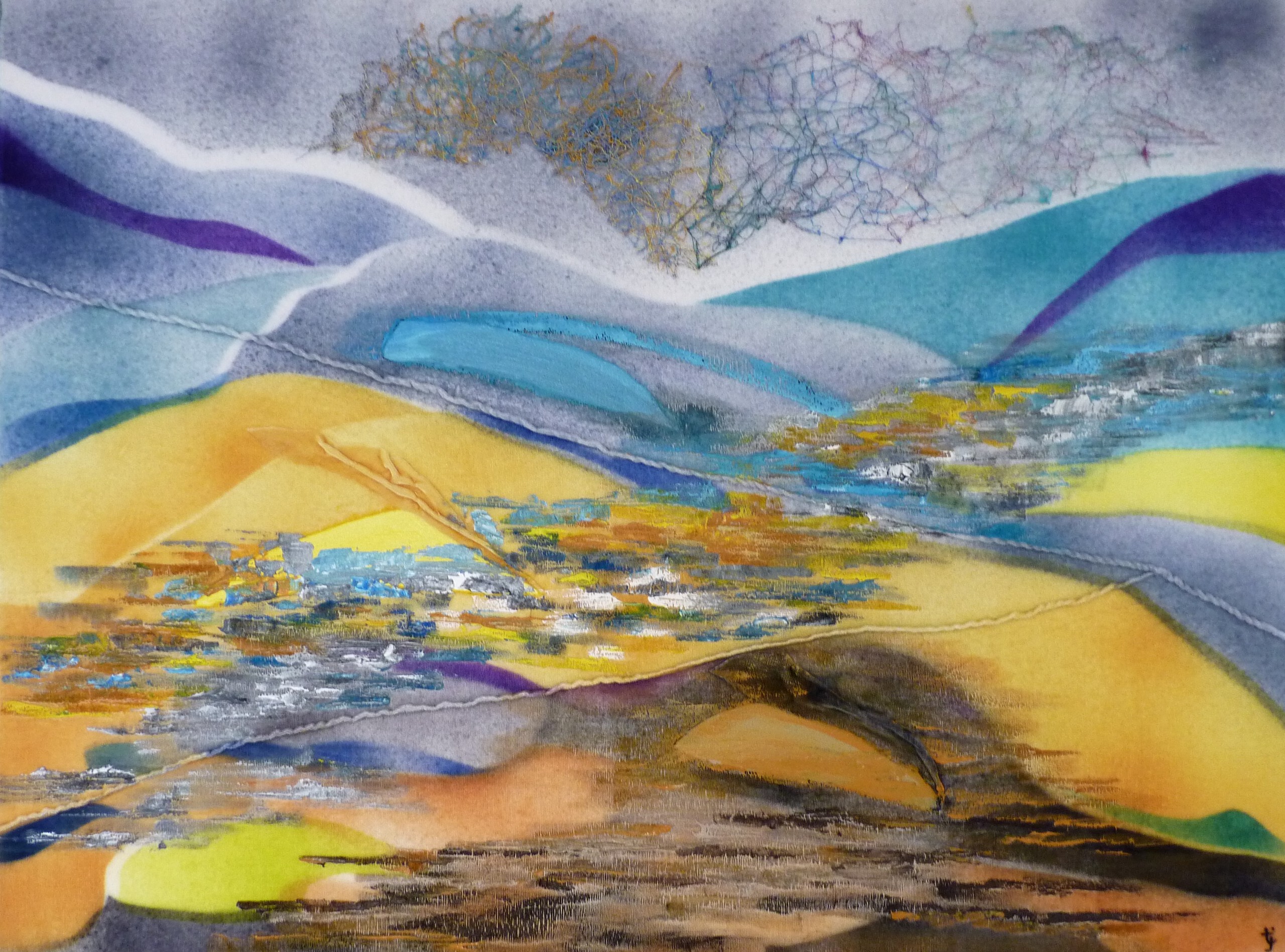 Het werk is gespoten en geschilderd op zijdefluweel. Ik heb hierbij verschillende technieken gebruikt o.a. machineborduren.