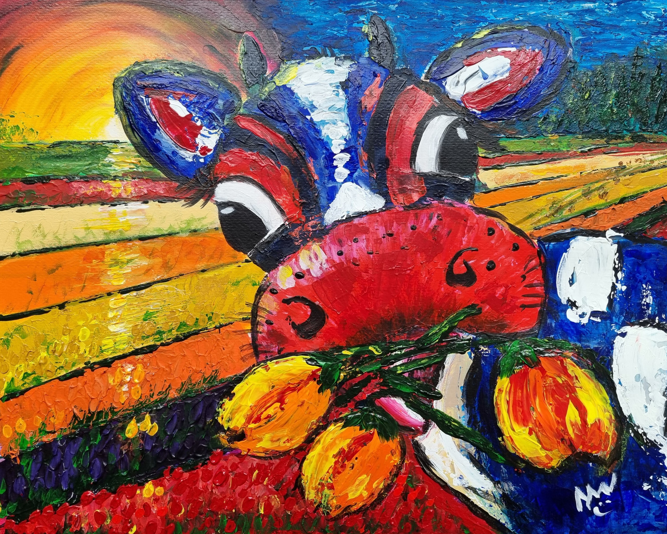 Het wedstrijdthema was, Hollands Glorie, kleur en tulpen. Dus ik zie een koe door een weide heen huppelen met een bek vol tulpen in rood/wit/blauw. en ziehier mijn werk. En vanuit de 82 inzendingen mocht ik, samen met 39 anderen, echt ook komen te hangen in het museum de Zwarte tulp. Hoe leuk is dat :) en nog leuker.... het is daar verkocht