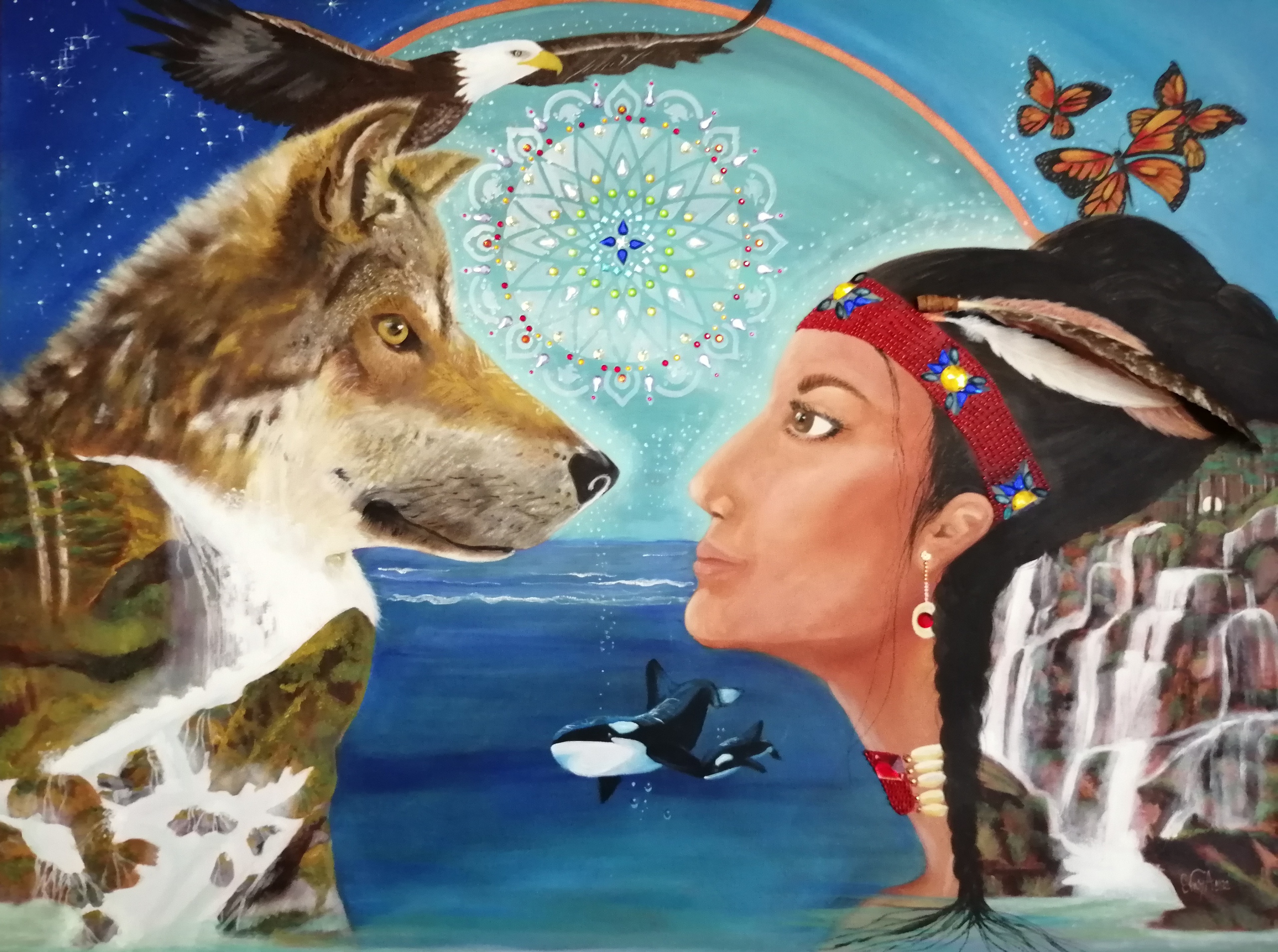 De filosofie van Native Americans is gebaseerd op de natuur, alles wat leeft heeft een 'spirit' en is verbonden met elkaar. Dat is ook de manier waarop ik werk als professional counselor en als kunstenares. Op zoek naar die verbinding. Ik begin mijn schilderijen altijd intuitief en hier ontstond het gezicht in de eerste verflaag. Van waaruit ik het verder ben gaan opbouwen en tot een idee kwam. Uiteindeijk is het de mens, dier en natuur ontstaan. Daarbij toegevoegd Diamond Painting Free style met kleine steentjes.