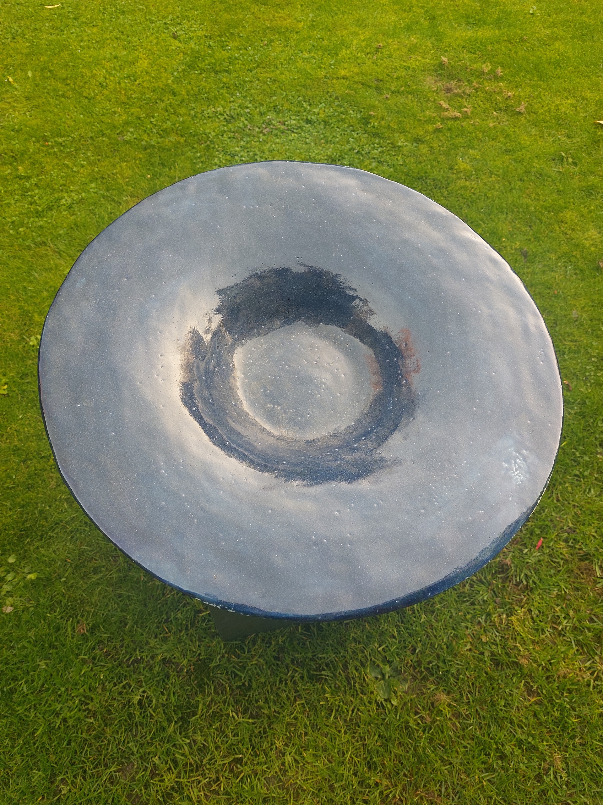 Grote schaal met donkerblauwe glazuur. Kan bijvoorbeeld gebruikt worden als fruitschaal of bloemstuk.