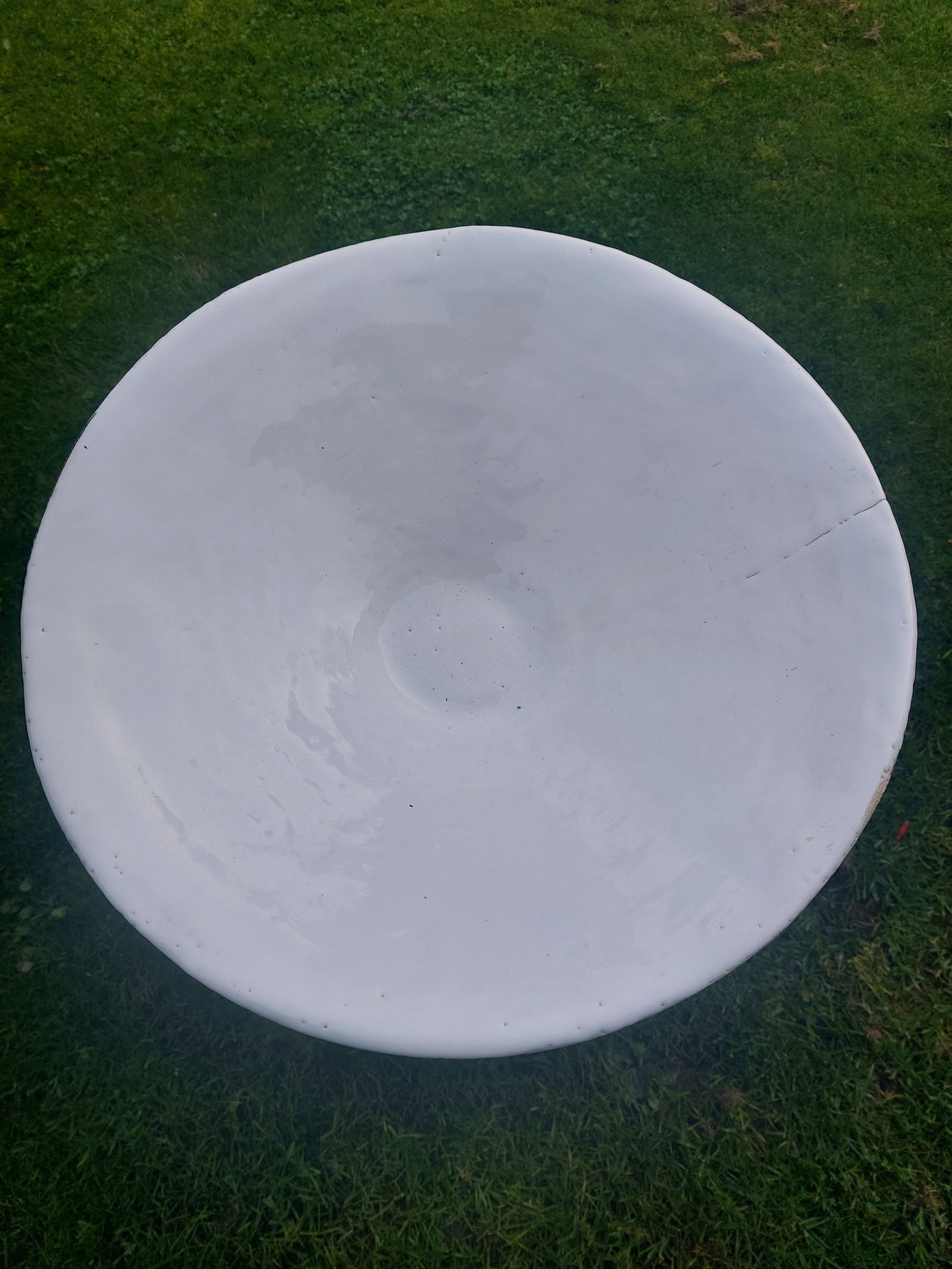 Grote schaal met witte glazuur. Kan bijvoorbeeld gebruikt worden als fruitschaal of om bloemstuk in te leggen.