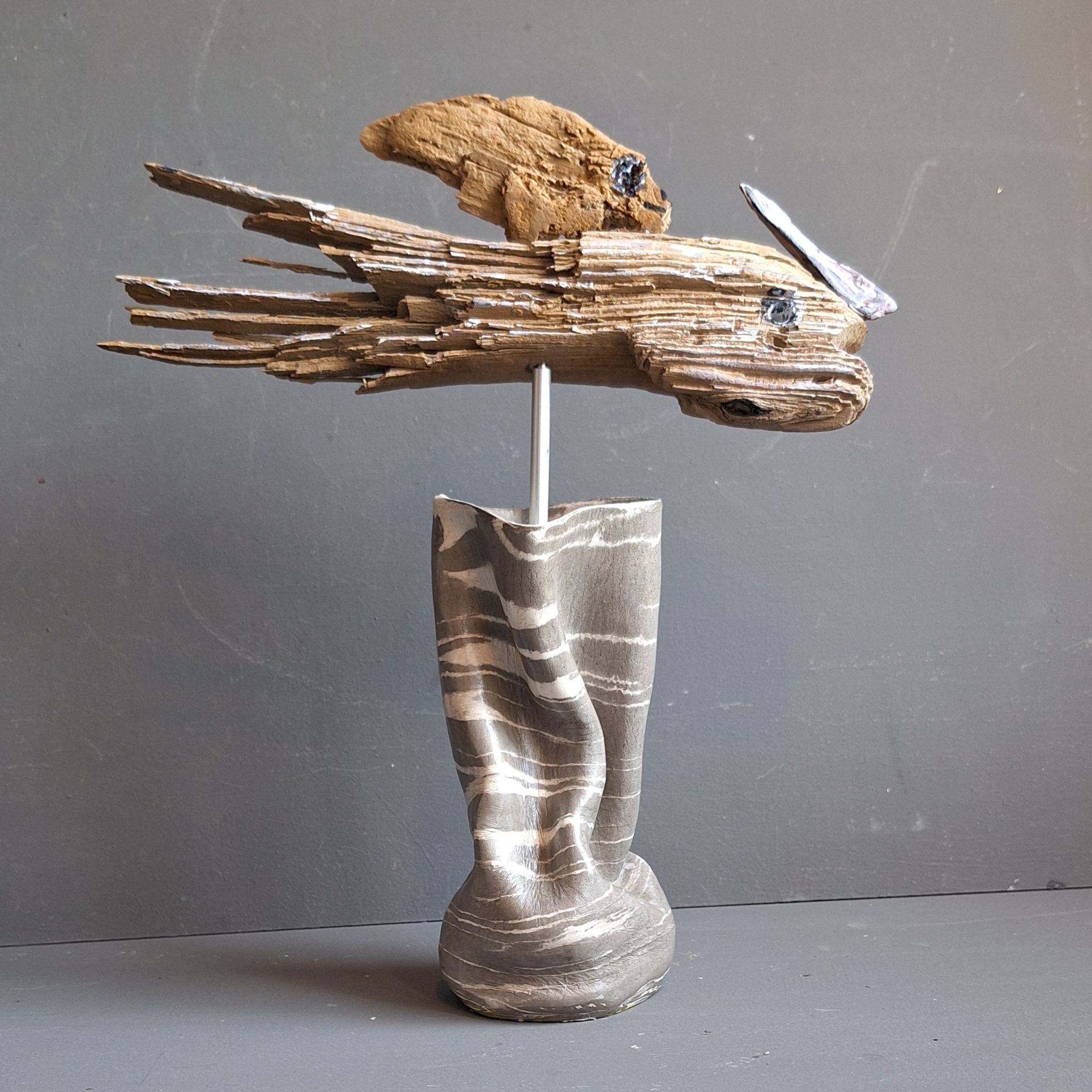 Kreukelvaasje met driftwood flower luchtdrogende klei.K25