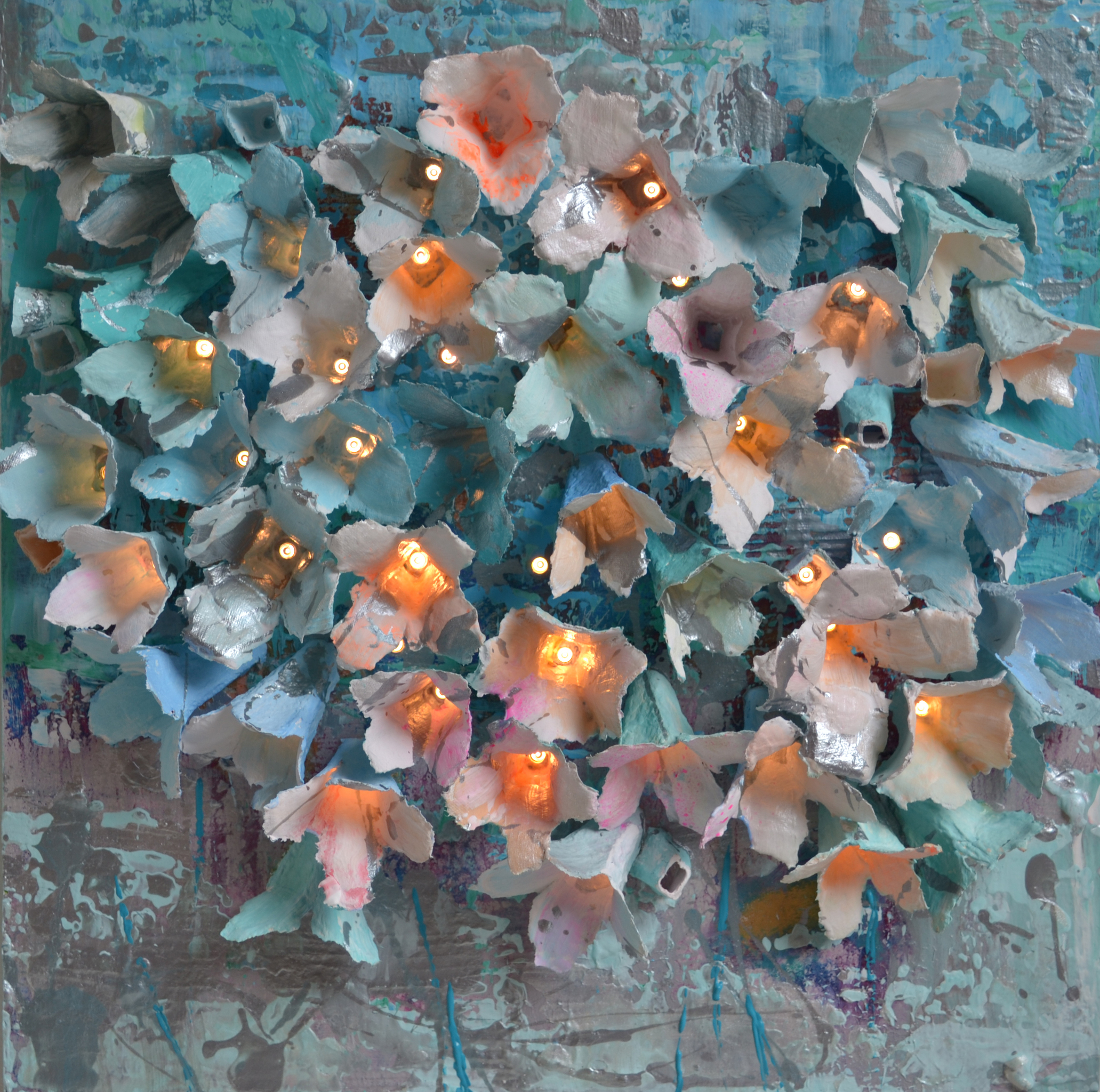 A captivating 3D art piece featuring delicately sculpted papier-mâché flowers adorned with paint, emitting a gentle glow in darkness. Embedded LED lights, strategically placed through slender apertures, can be programmed on a timer, casting a serene ambiance for six hours each evening. Inspired by the enchanting moon flowers, this artwork is a luminous ode to extending the warmth of daylight into our homes during the longer, darker nights. Perfect for creating a cozy and meditative atmosphere, especially as the days grow shorter.