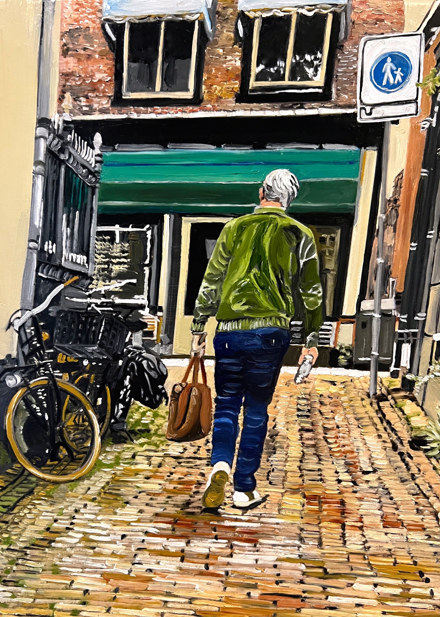 Schilderij Man Werk Binnenstad Ochtend Gorinchem Weessteeg