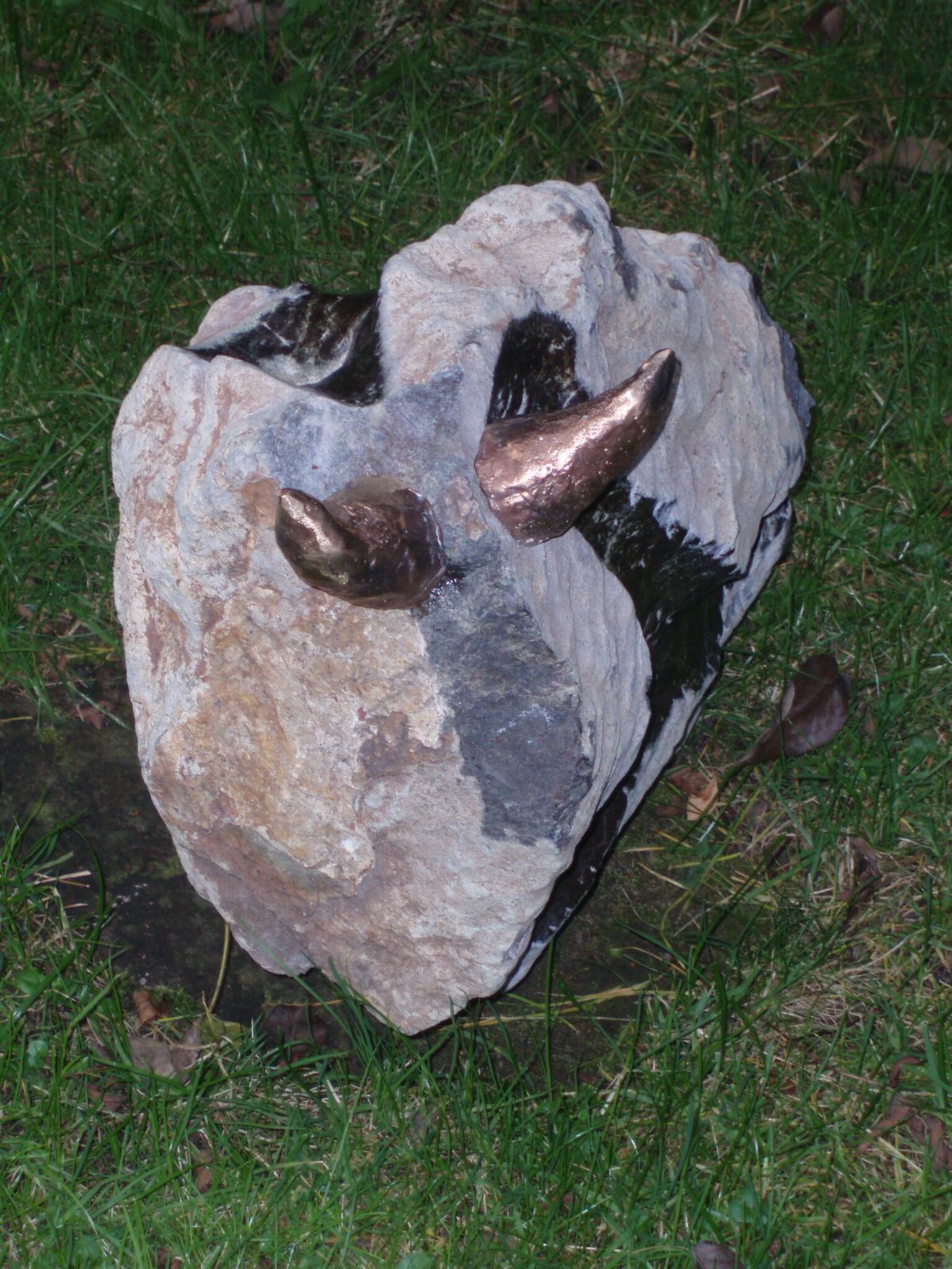 Deze oeros straalt samengebalde oerkracht uit. Voor deze oeros is een stuk fruitstone zo min mogelijk bewerkt om de oorspronkelijke aard van de steen tot uiting te brengen. Dit stoere stuk herbergde een imposante oeros in zich. Hoorns van brons.