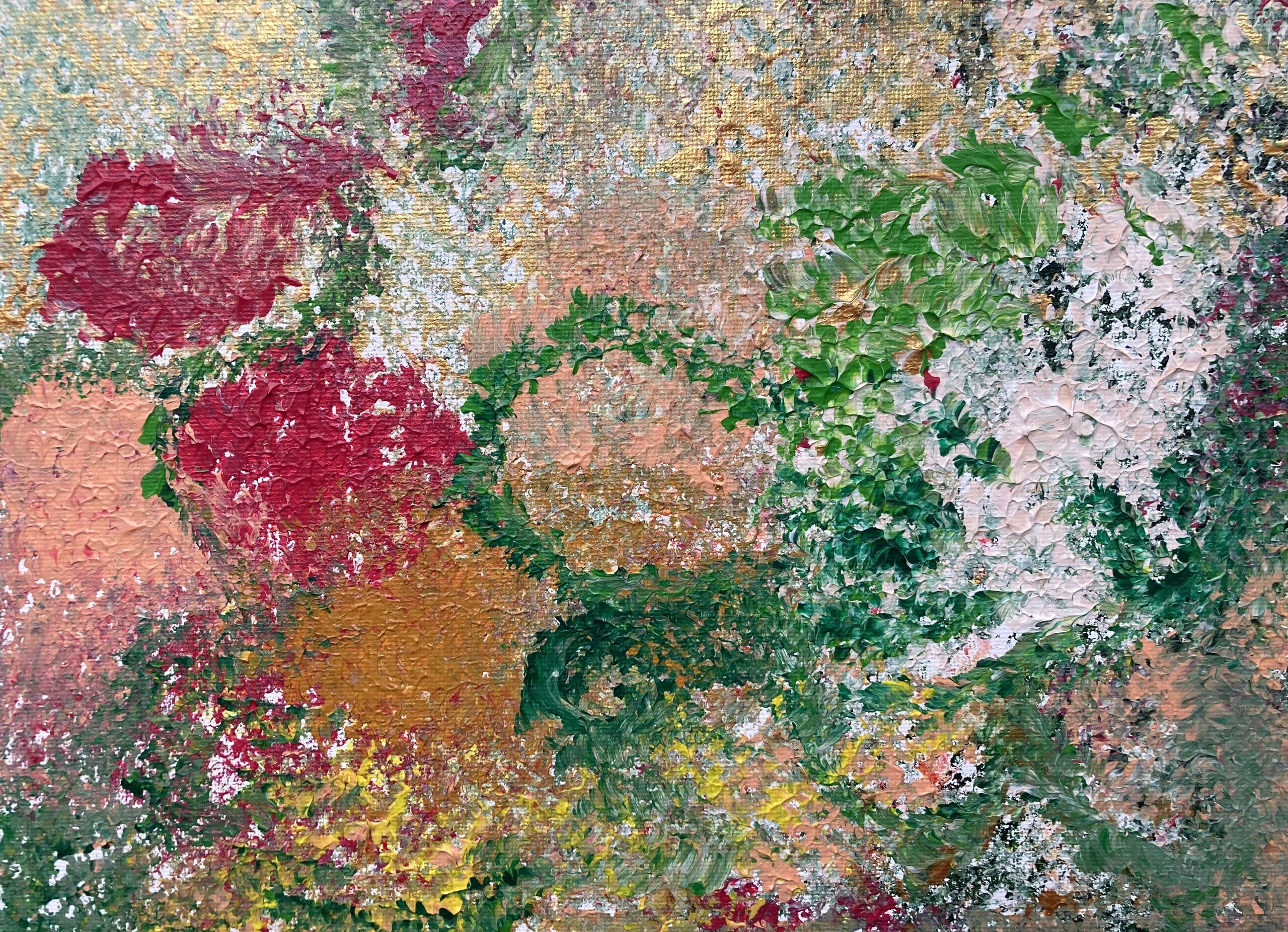 Na een dag schilderen met broerlief, blijven er allerlei kleuren verf op het palet liggen. Afgezet op een paneeltje lijkt het precies op m'n zomerse theetuintje.