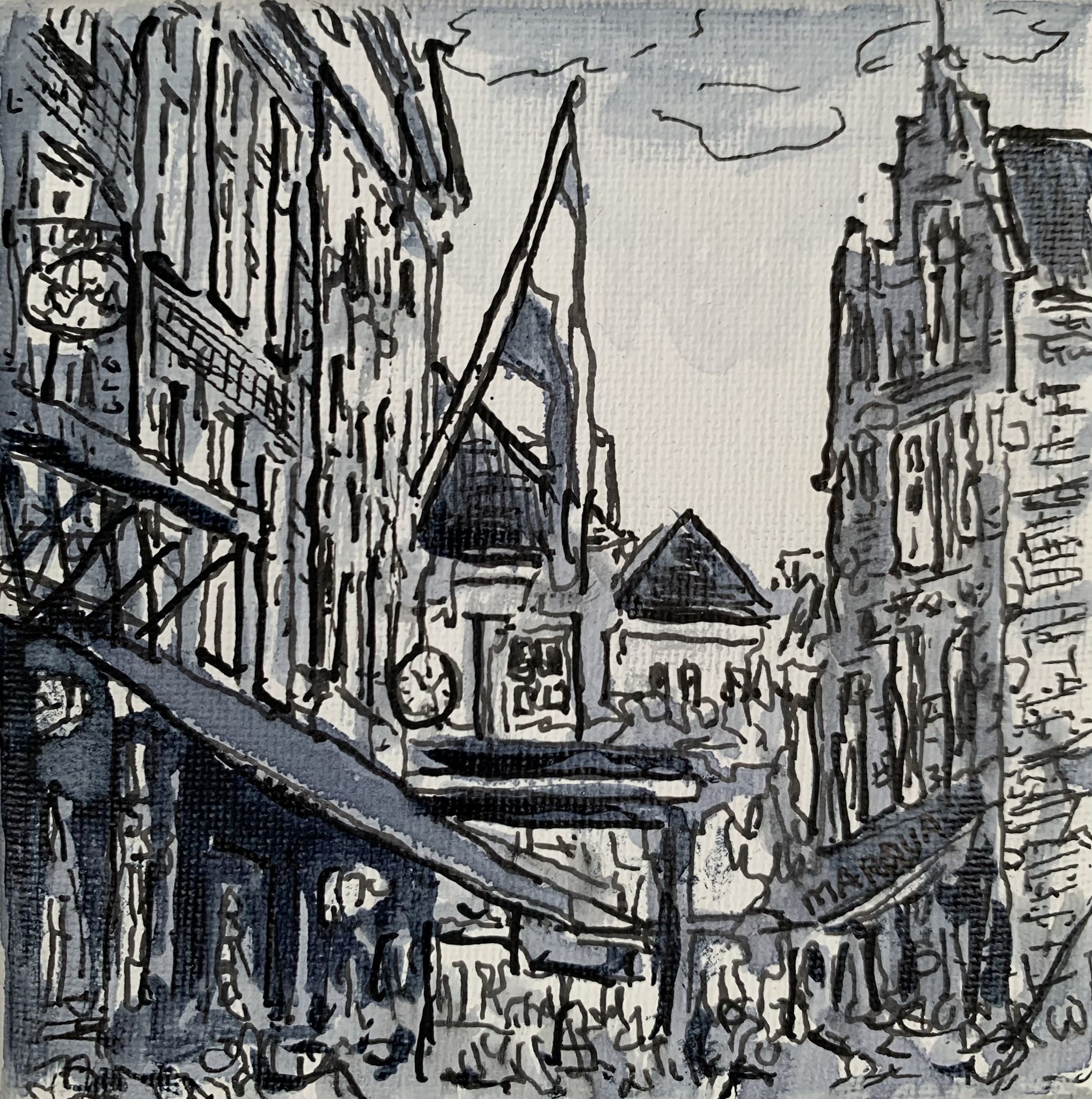 Inktschilderij Uilenburg/Korenbrugstraat, getekend en geschilderd in paynes grey inkt op doek 10x10 cm.