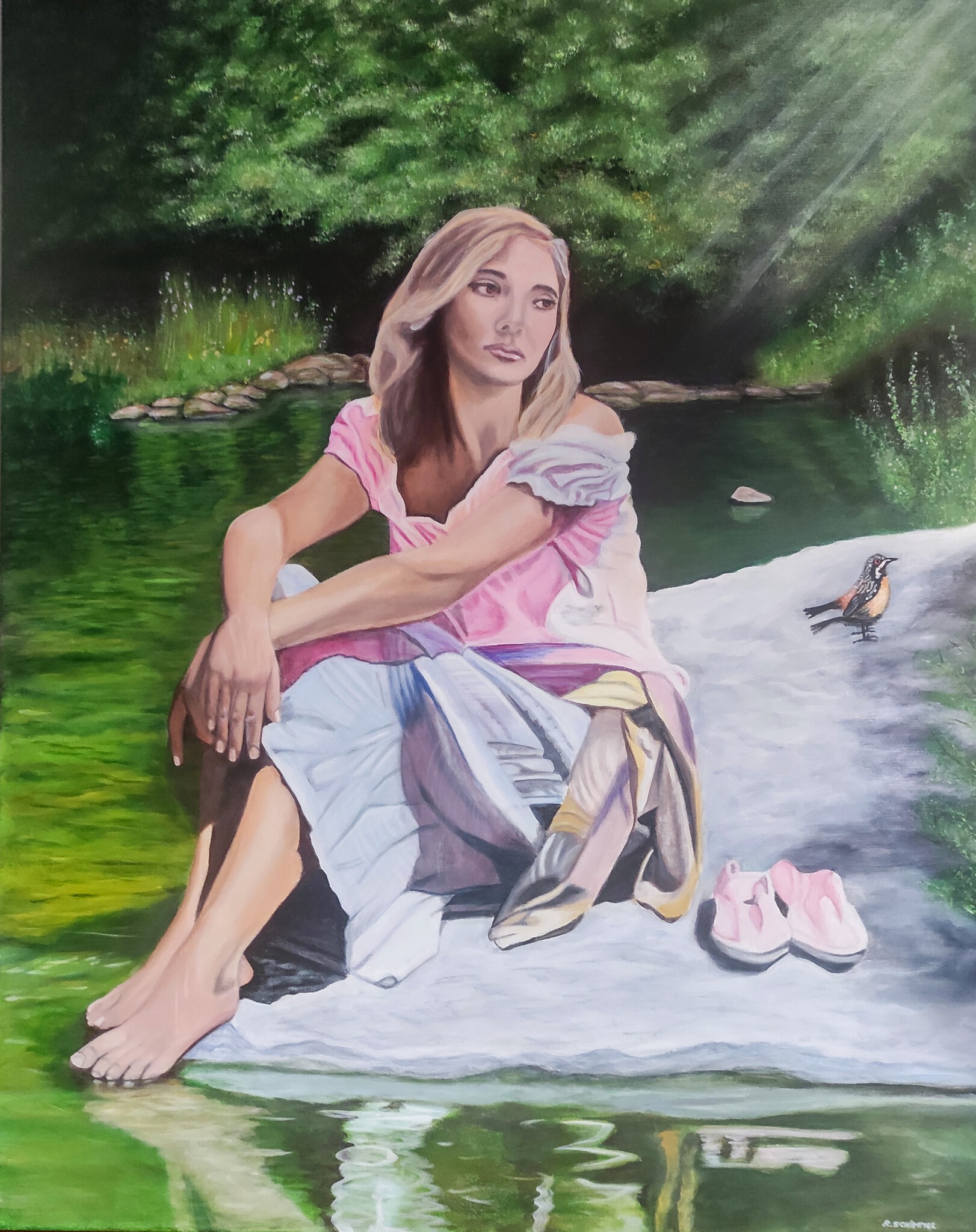 Jonge vrouw bij de oever van een beek Het schilderij is gemaakt met acryl, wat te zien is aan de textuur en de diepte van de kleuren. Het toont een vrouw die bij een waterlichaam zit, met op de achtergrond bomen en een vogel op een rots. De stijl kan worden omschreven als realistisch, met aandacht voor detail in de figuren en de gezichts uitdrukking