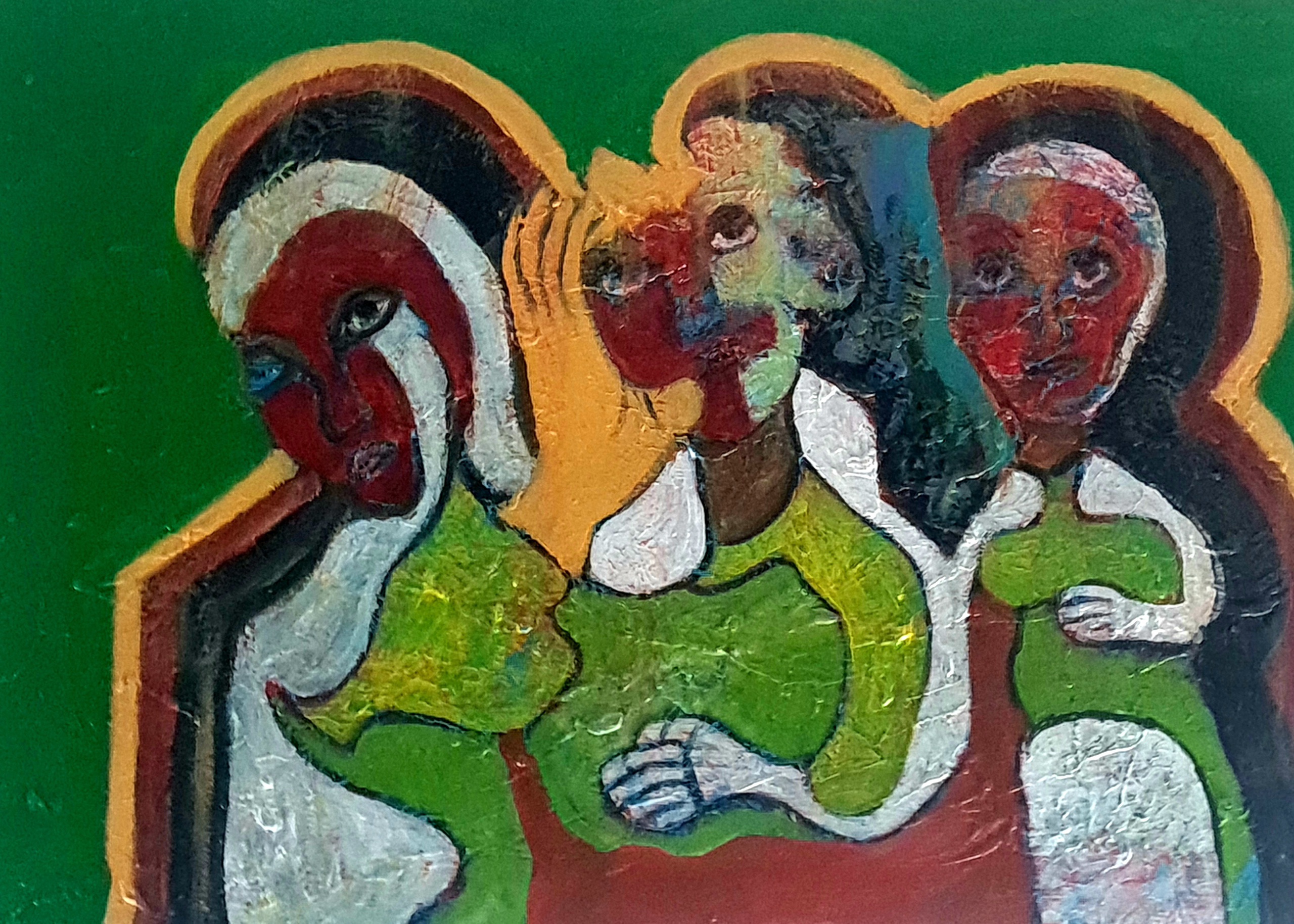 Het schilderij toont een dynamische en complexe compositie van menselijke figuren, samengebracht in een spel van vervorming, kleur en emotie. De drie personages lijken verbonden, maar tegelijkertijd gevangen in hun eigen wereld, een metafoor voor de dualiteit van menselijke relaties: nabijheid en afstand. De groene achtergrond straalt een sfeer van leven en natuur uit, maar de figuren, opgebouwd uit contrasterende kleuren zoals rood, wit en geel, suggereren innerlijke worstelingen en onderlinge spanning. De hand, prominent geplaatst tussen de figuren, lijkt zowel een gebaar van bescherming als een barrière. Het kan gezien worden als een poging om stilte op te leggen, een geheim te bewaren, of juist een poging tot communicatie.