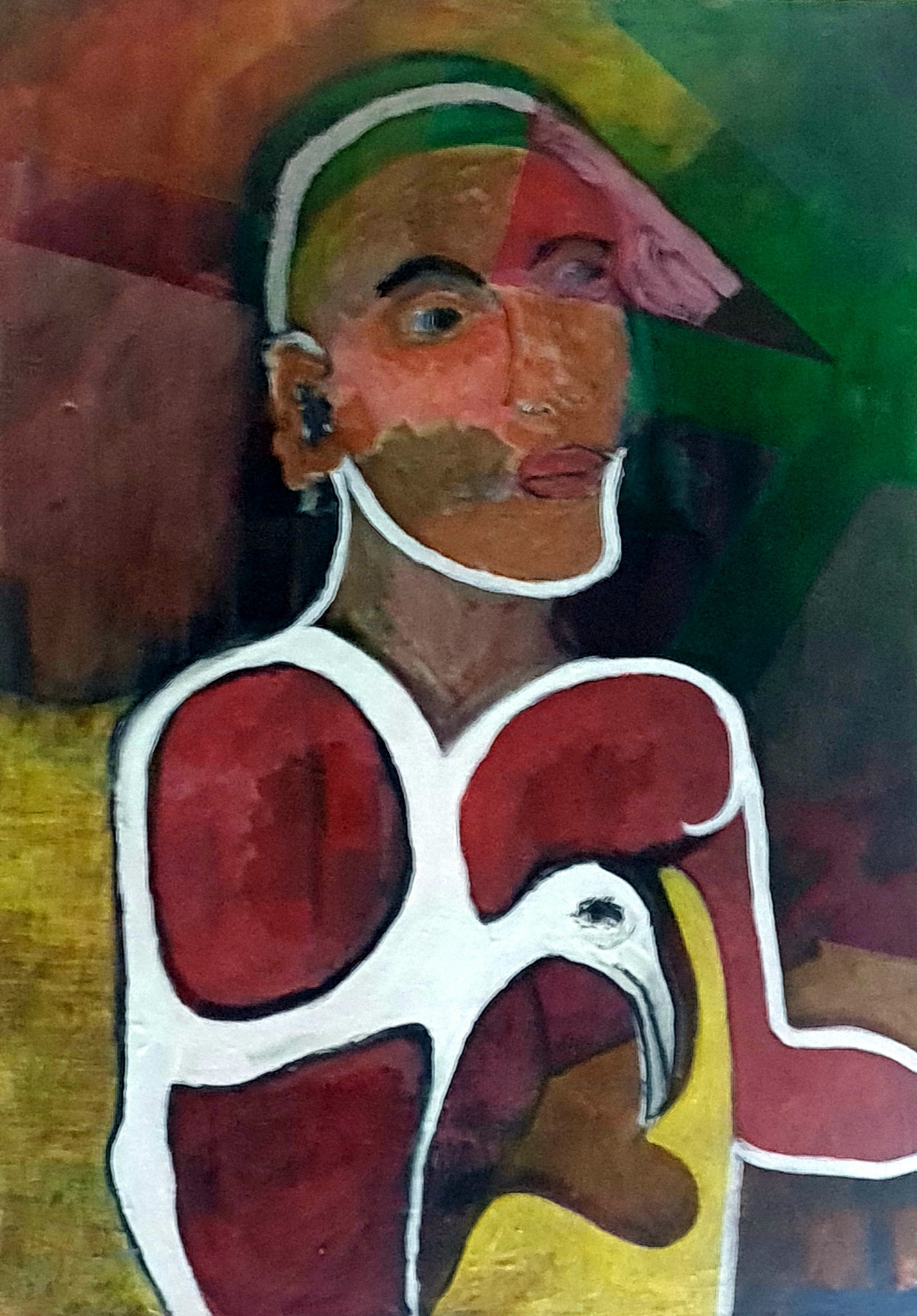 Het verhaal achter dit schilderij zou kunnen draaien om een personage dat worstelt met een traumatische ervaring. De witte lijnen die het lichaam omringen, lijken op een soort beschermend schild of zelfs een wondverband, terwijl het rode deel doet denken aan een blootgelegde kern van emoties en kwetsbaarheid. Er is ook een vogelachtige vorm te zien, ingebed in het lichaam van de figuur. Misschien symboliseert dit een innerlijke stem of een geestelijke gids, die het personage begeleidt in zijn strijd. De vogel, een symbool van vrijheid, lijkt gevangen te zitten, wat kan wijzen op een gevoel van onderdrukking of een onvermogen om te ontsnappen aan innerlijke pijn.