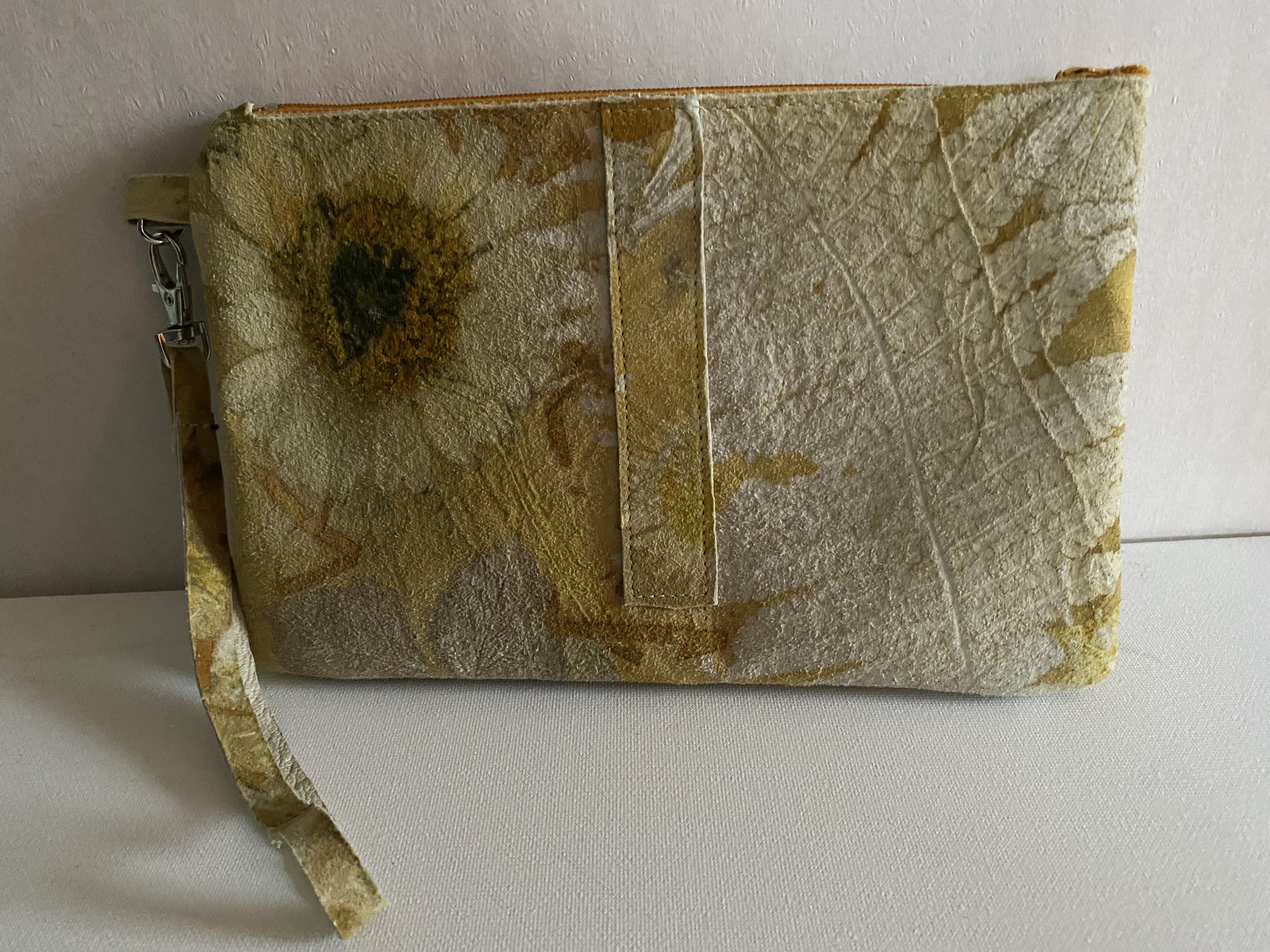 Onder andere een zonnebloem en print van een varen is op dit tasje te zien dat geprint is op geitenleer. Het tasje sluit met een rits en is gevoerd met een katoenen ecoprint. Het tasje heeft een polsbandje. Het is een stevig tasje, uniek in zijn soort.
