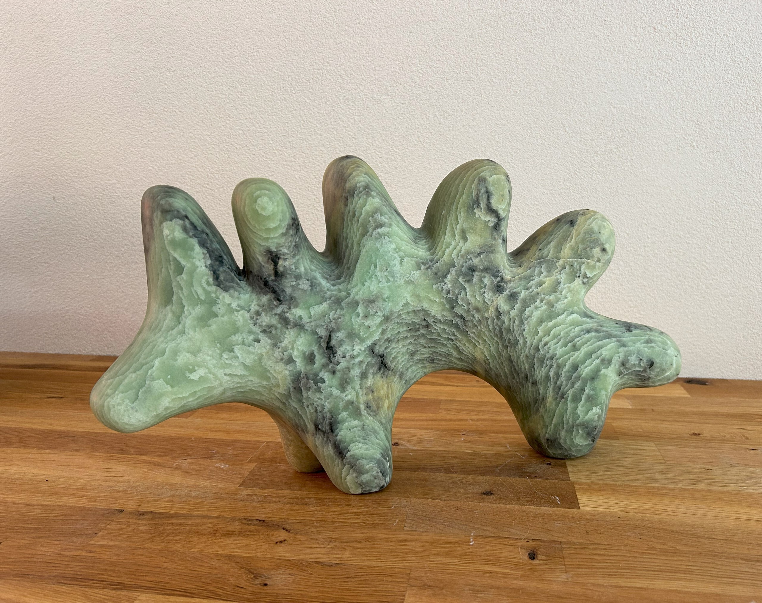 Dit beeld uit speksteen volgt op speelse wijze de lijnen van de steen, en wordt zo tot een vrolijk fantasie-achtige dino.