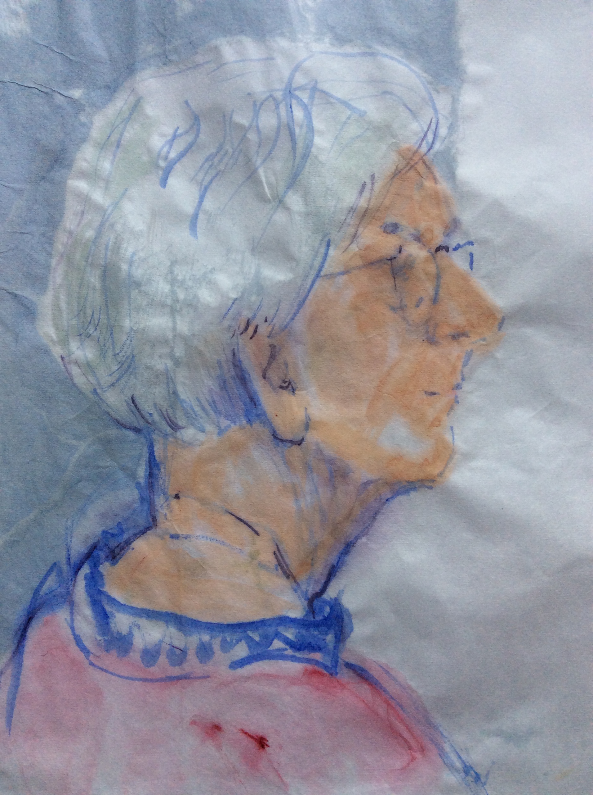 Vrouw en profil gezien met wit haar. Aquarel op Japans papier.