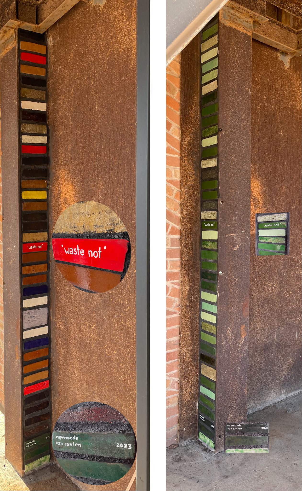 Een kolom van geglazuurde bakstenen. Ik glazuurde afgekeurde bakstenen met restglazuren en metselde de kolom in in een stalen H-balk op de steenbakkerij. Eén kolom is met tinten groen, de andere kolom met verschillende kleuren.