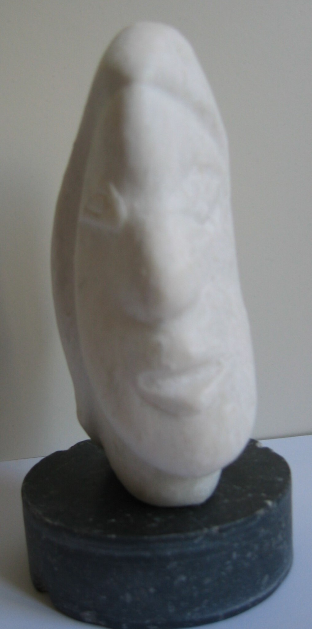 Gezicht van wit speksteen op een sokkel van Belgisch hardsteen
