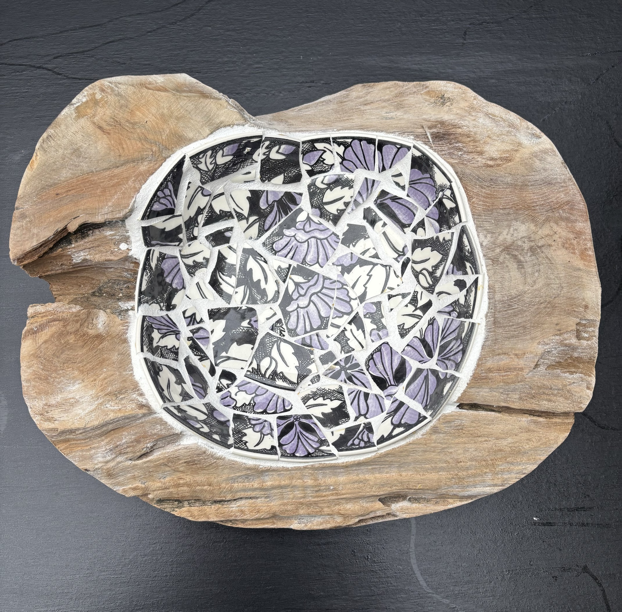 Schaal van teakhout bewerkt met een porseleinen zwart/paars bord.