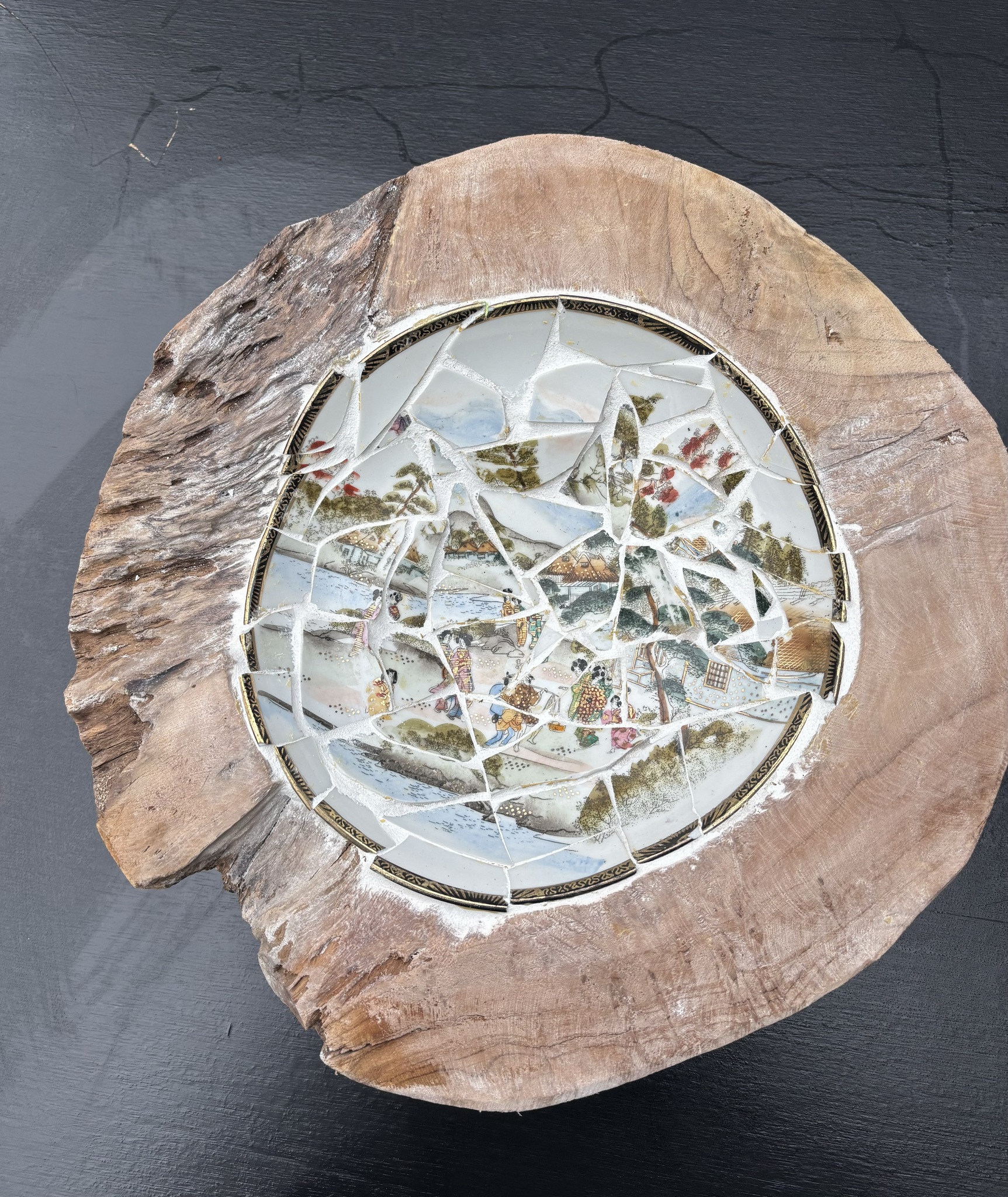 Teakhouten schaal bewerkt met een Japans porselein bord.