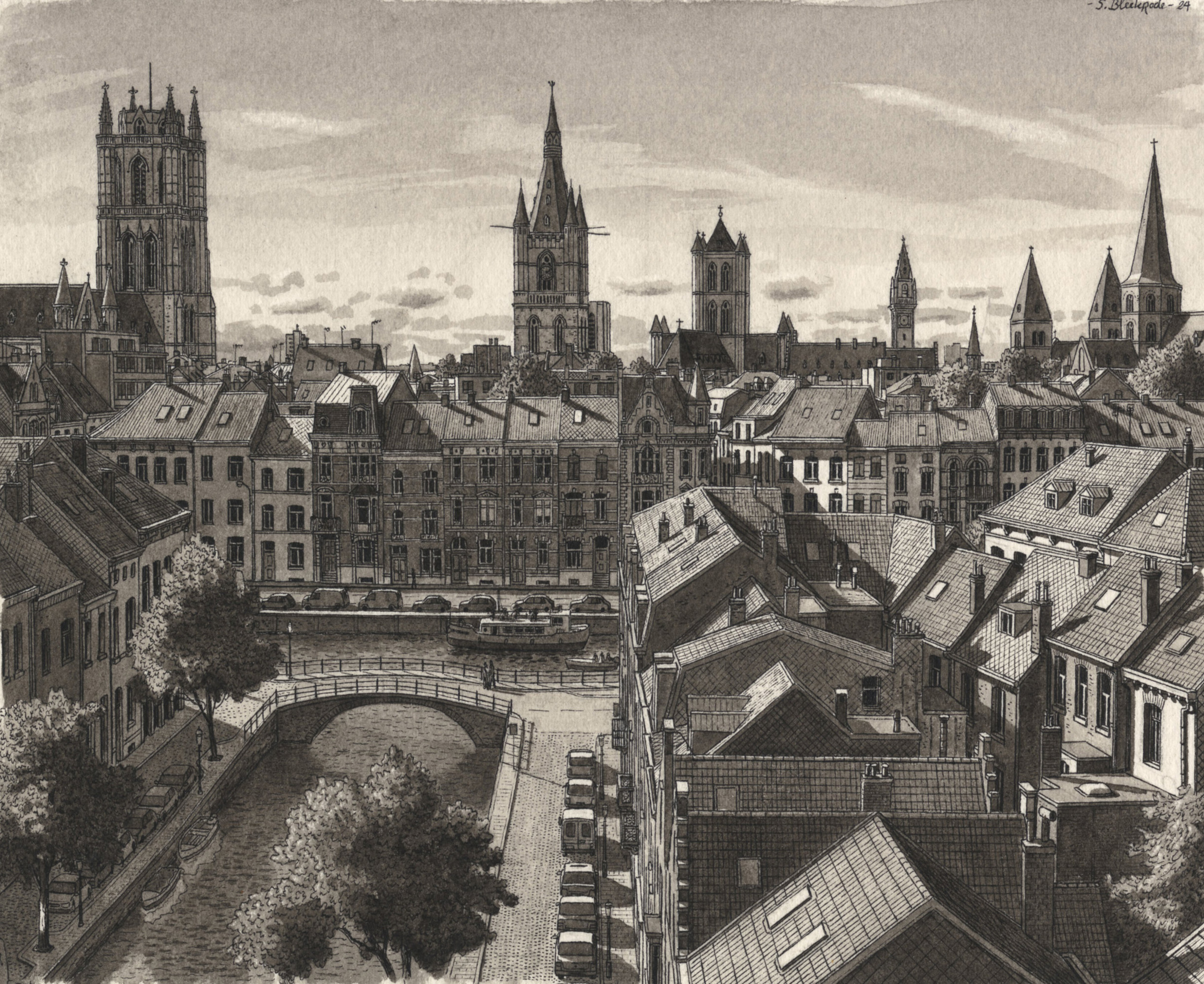 Art Aquarel Tekening Kunst Inkt Drawing Architectuur Architecture Stad City Skyline Gent Watercolour Belgium België Ink Ghent