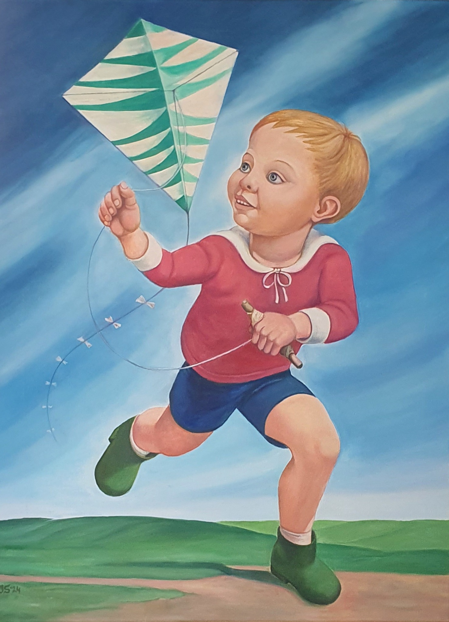 Jongen met vlieger, in opdracht geschilderd, naar een werk van Theo L'herminez. Dit werk valt onder het magisch realisme, de jongen is realistisch maar tegelijkertijd ook een beetje als een pop.