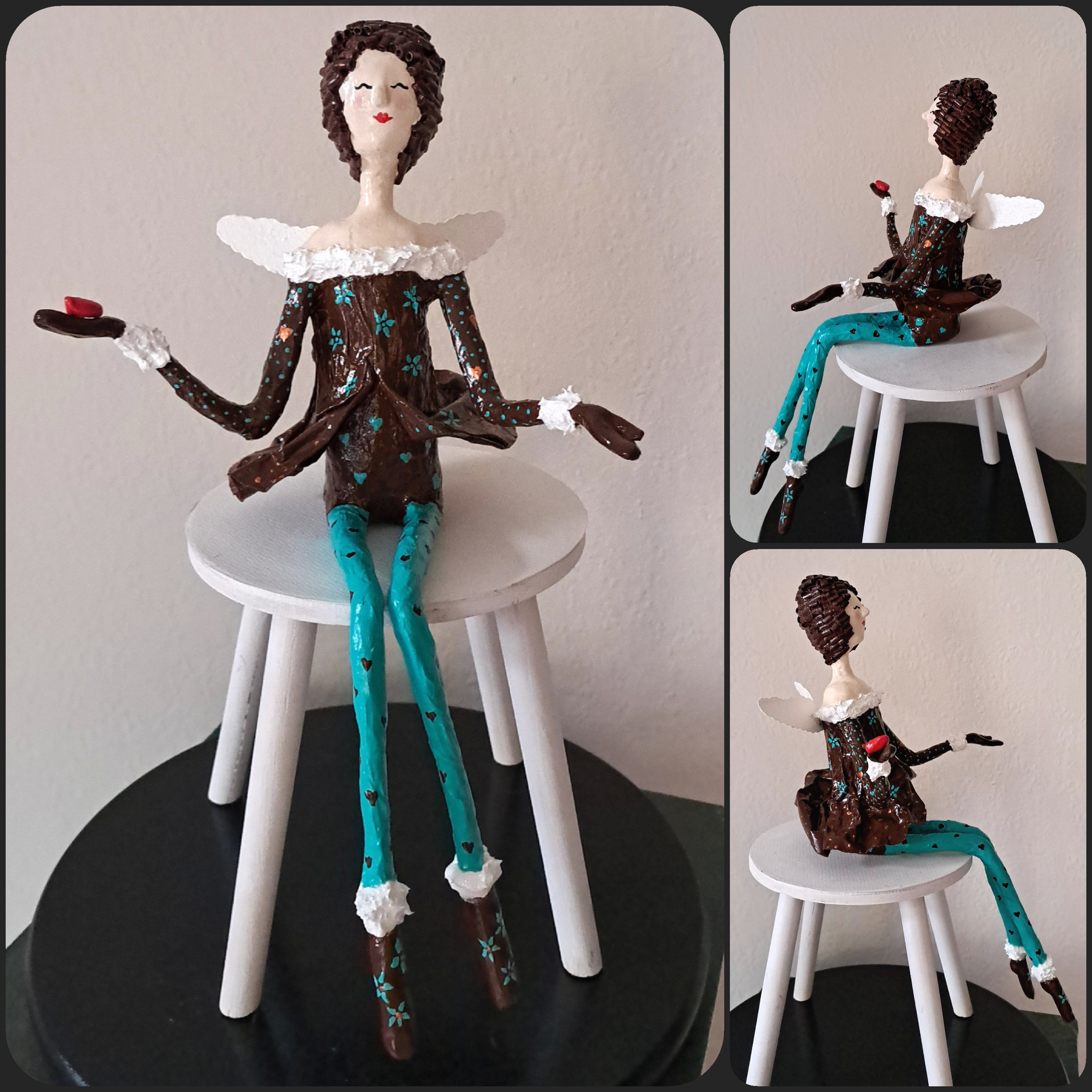 De Happy Angels hebben een zithoogte van ongeveer 25 tot 25 cm (excl. de beentjes) met een totale lengte van ca. 55cm. Mixed media o.a. van papier-mache, papierpulp.