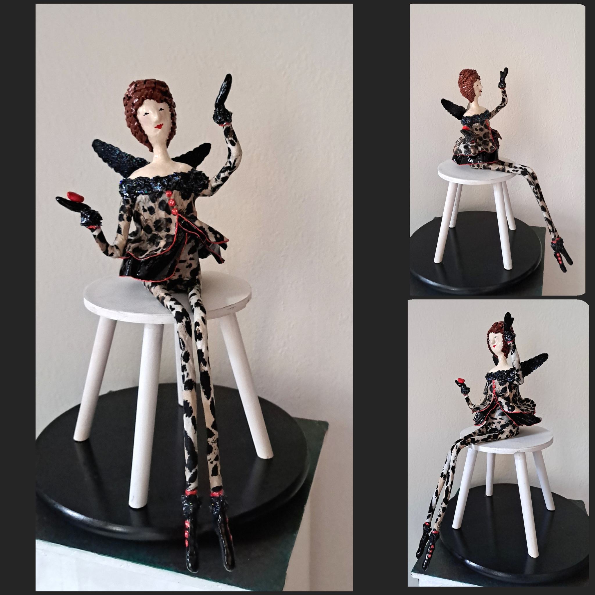 De Happy Angels hebben een zithoogte van ongeveer 20 tot 25 cm (excl. de beentjes) met een totale lengte van ca. 55cm. Mixed media o.a. van papier-mache, papierpulp.